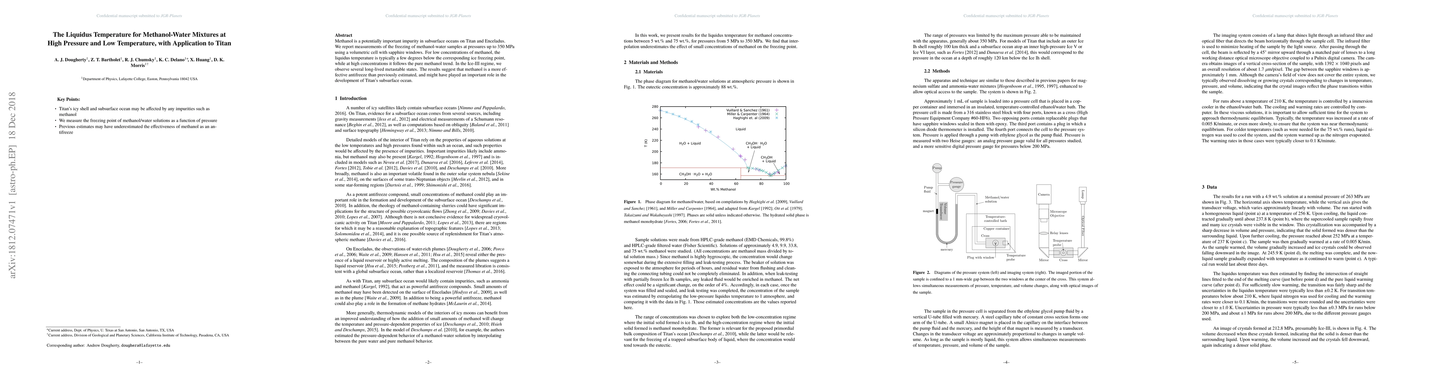 Methanol is a potentially important impurity in subsurface oceans on Titan and Enceladus. We report measurements of the freezing of methanol-water samples at pressures up to 350~MPa using a volumetric cell with sapphire windows. For low concentrations of methanol, the liquidus temperature is typically a few degrees below the corresponding ice freezing point, while at high concentrations it follows the pure methanol trend. In the Ice-III regime, we observe several long-lived metastable states. The results suggest that methanol is a more effective antifreeze than previously estimated, and might have played an important role in the development of Titan's subsurface ocean.