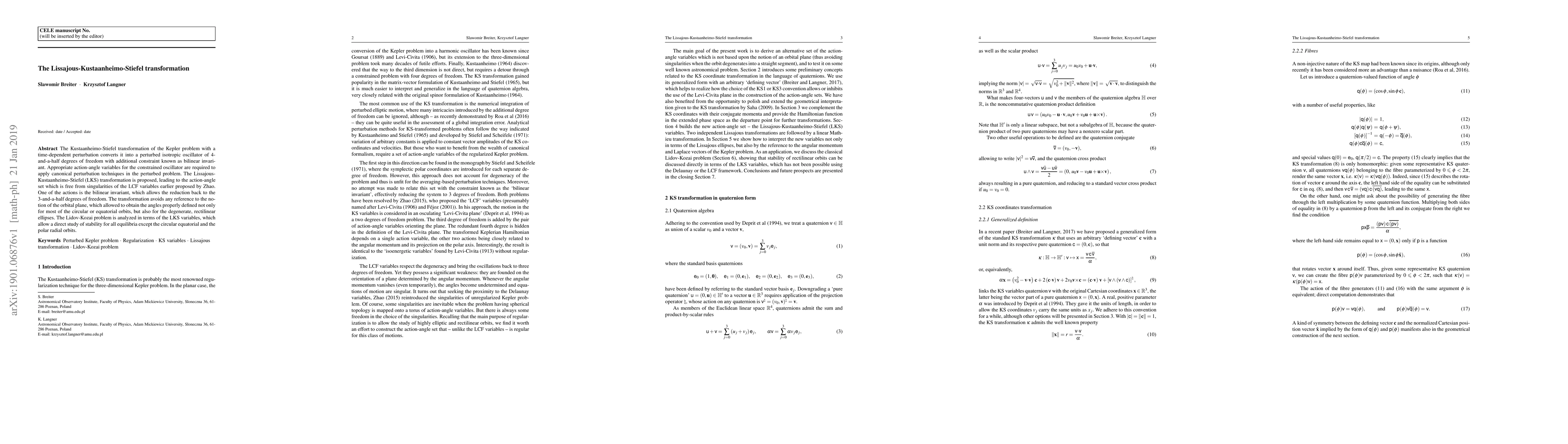 The Lissajous-Kustaanheimo-Stiefel (LKS) transformation converts the Kepler problem with perturbations into a perturbed isotropic oscillator, providing a singularity-free action-angle variable set that facilitates canonical perturbation techniques. This transformation enables the study of stability in the Lidov-Kozai problem for all equilibria except circular equatorial and polar radial orbits.