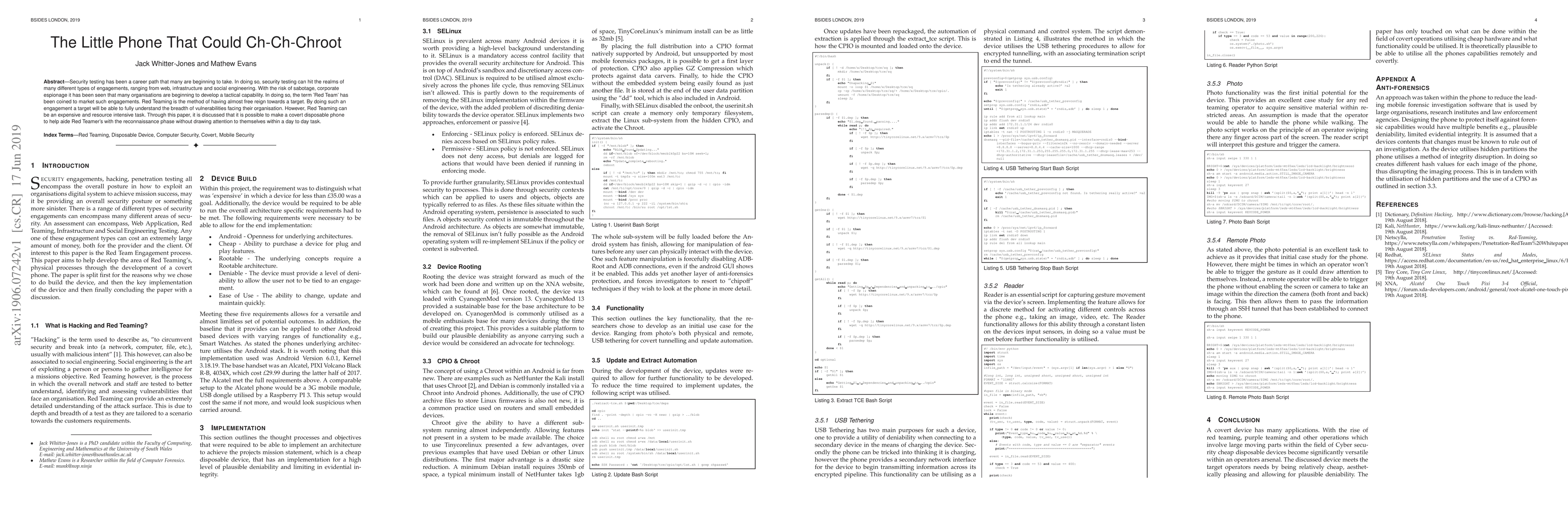 Security testing has been a career path that many are beginning to take. In doing so, security testing can hit the realms of many different types of engagements, ranging from web, infrastructure and social engineering. With the risk of sabotage, corporate espionage it has been seen that many organisations are beginning to develop a tactical capability. In doing so, the term 'Red Team' has been coined to market such engagements. Red Teaming is the method of having almost free reign towards a target. By doing such an engagement a target will be able to fully understand the breadth of vulnerabilities facing their organisation. However, Red Teaming can be an expensive and resource intensive task. Through this paper, it is discussed that it is possible to make a covert disposable phone to help aide Red Teamer's with the reconnaissance phase without drawing attention to themselves within a day to day task.