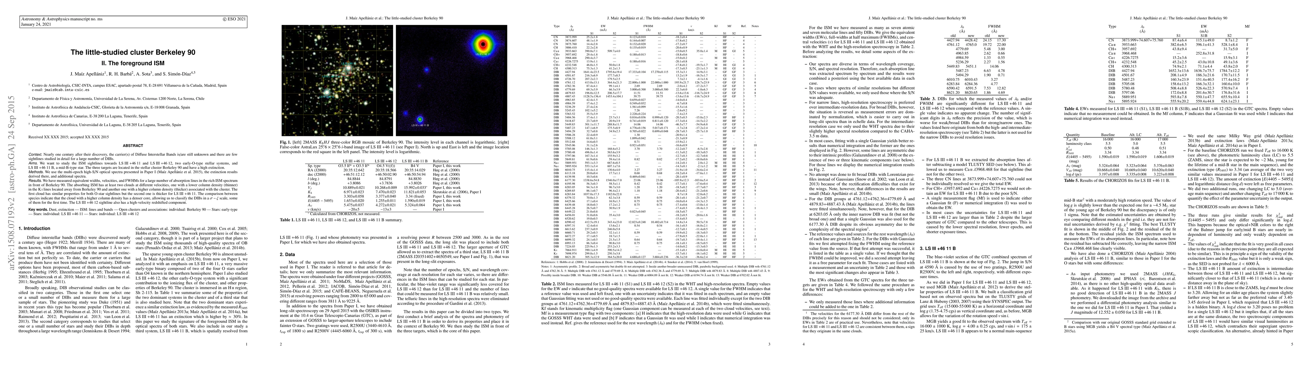 Context: Nearly one century after their discovery, the carrier(s) of Diffuse Interstellar Bands is/are still unknown and there are few sightlines studied in detail for a large number of DIBs. Aims: We want to study the ISM sightlines towards LS III +46 11 and LS III +46 12, two early-O-type stellar systems, and LS III +46 11 B, a mid-B-type star. The three targets are located in the stellar cluster Berkeley 90 and have a high extinction. Methods: We use the multi-epoch high-S/N optical spectra presented in paper I (Ma\'iz Apell\'aniz et al. 2015), the extinction results derived there, and additional spectra. Results: We have measured equivalent widths, velocities, and FWHMs for a large number of absorption lines in the rich ISM spectrum in front of Berkeley 90. The absorbing ISM has at least two clouds at different velocities, one with a lower column density (thinner) in the K I lines located away from Berkeley 90 and another one with a higher column density (thicker) associated with the cluster. The first cloud has similar properties for both O-star sightlines but the second one is thicker for LS III +46 11. The comparison between species indicate that the cloud with a higher column density has a denser core, allowing us to classify the DIBs in a sigma-zeta scale, some of them for the first time. The LS III +46 12 sightline also has a high-velocity redshifted component.