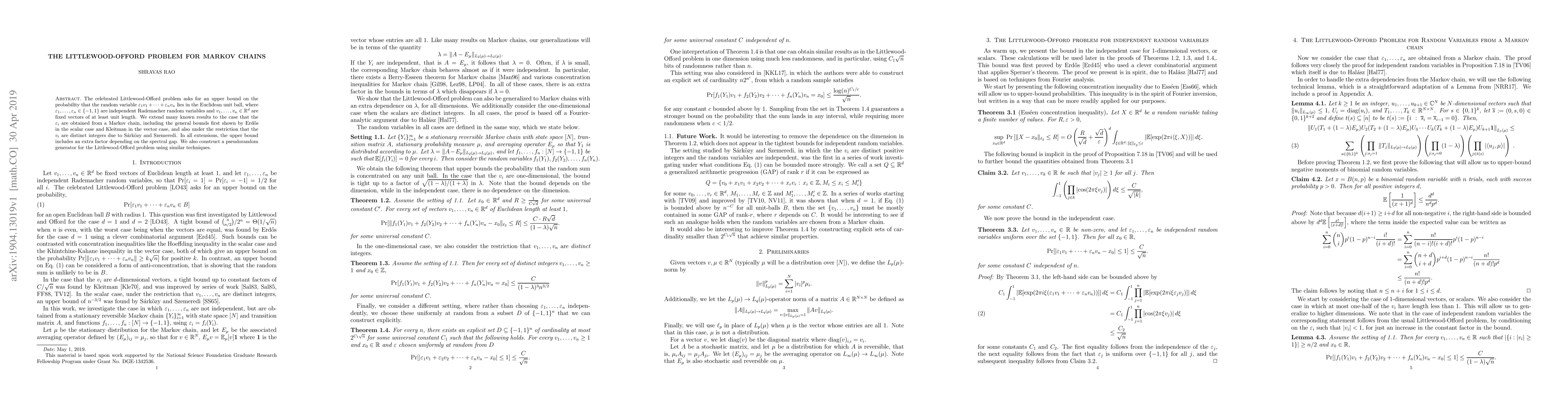 This paper extends the Littlewood-Offord problem to Markov chains, providing upper bounds on the probability of a random variable lying in the unit ball, with an additional factor dependent on the spectral gap. It also constructs a pseudorandom generator for the problem using similar techniques.