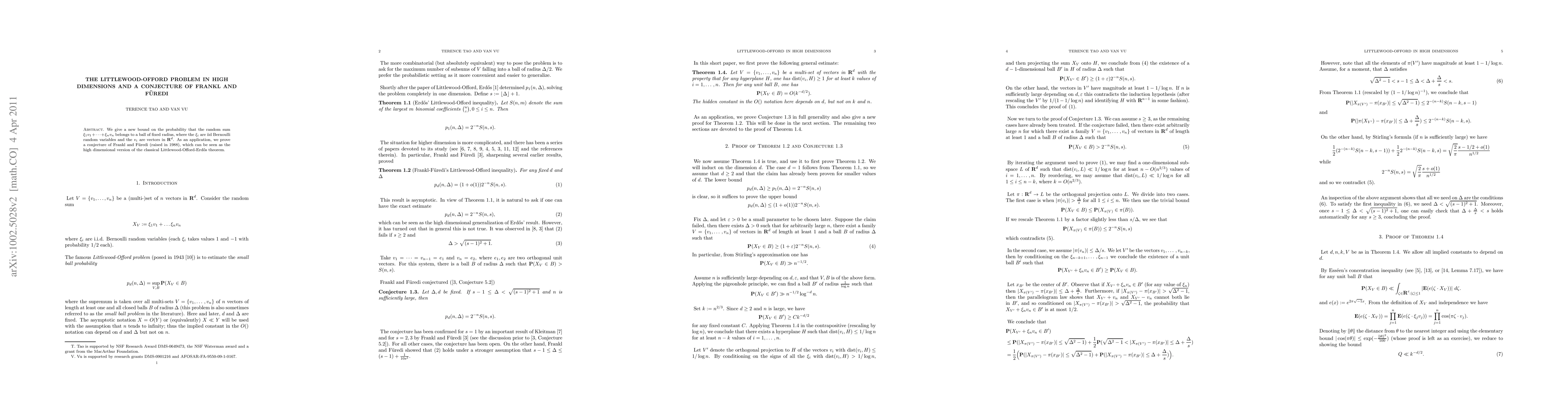 We give a new bound on the probability that the random sum $\xi_1 v_1 +...+ \xi_n v_n$ belongs to a ball of fixed radius, where the $\xi_i$ are iid Bernoulli random variables and the $v_i$ are vectors in $\R^d$. As an application, we prove a conjecture of Frankl and F\"uredi (raised in 1988), which can be seen as the high dimensional version of the classical Littlewood-Offord-Erd\H os theorem.