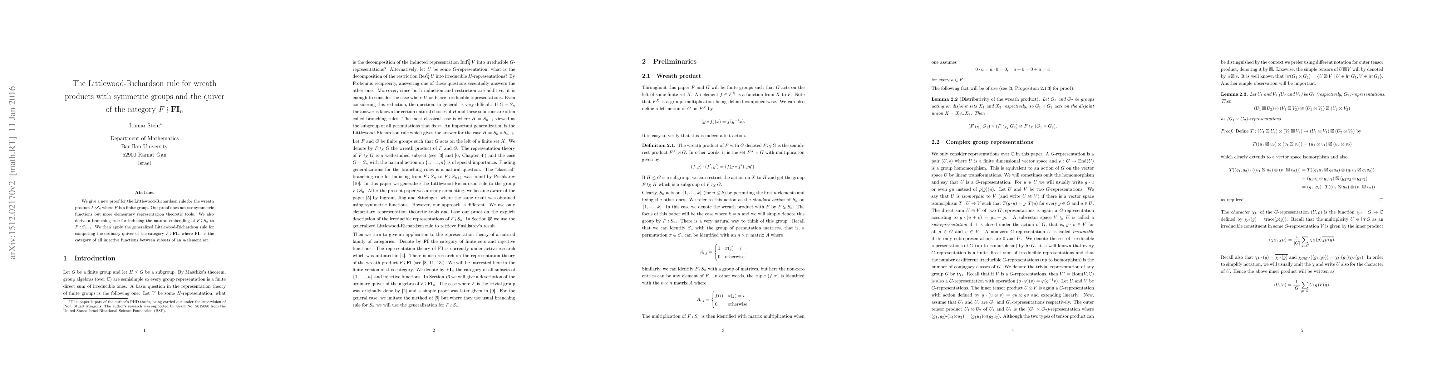 We give a new proof for the Littlewood-Richardson rule for the wreath product $F \wr S_{n}$ where $F$ is a finite group. Our proof does not use symmetric functions but more elementary representation theoretic tools. We also derive a branching rule for inducing the natural embedding of $F\wr S_{n}$ to $F\wr S_{n+1}$. We then apply the generalized Littlewood-Richardson rule for computing the ordinary quiver of the category $F \wr {\bf FI}_{n}$ where ${\bf FI}_{n}$ is the category of all injective functions between subsets of an $n$-element set.