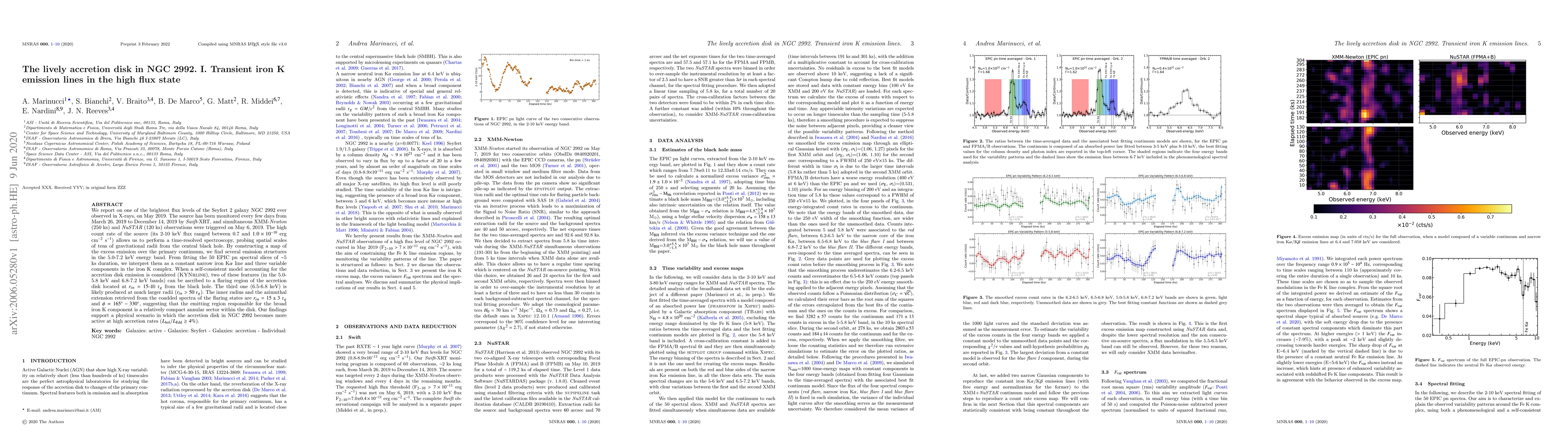 This study investigates the high flux state of the Seyfert 2 galaxy NGC 2992, revealing transient iron K emission lines through time-resolved spectroscopy. The analysis identifies three variable components in the iron K complex, two of which are attributed to a flaring region within the accretion disk near the central black hole.