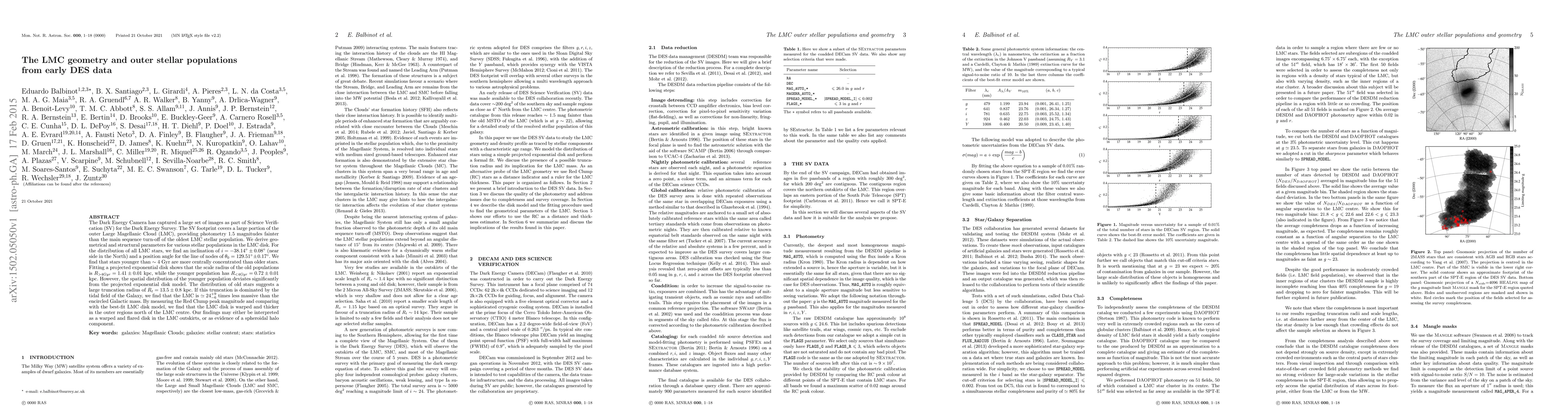 This paper analyzes the geometry and structure of the outer stellar populations in the Large Magellanic Cloud (LMC) using early Dark Energy Survey data. The study finds an inclination of $i=-38.14^{\circ}$ and a position angle of $\theta_0=129.51^{\circ}$, revealing that younger stars are more centrally concentrated than older ones, with scale radii of $R_{>4 Gyr}=1.41$ kpc and $R_{<4 Gyr}=0.72$ kpc respectively. The LMC disk is suggested to be warped and thicker in the outer regions, potentially indicating a flared disk or a spheroidal halo component.