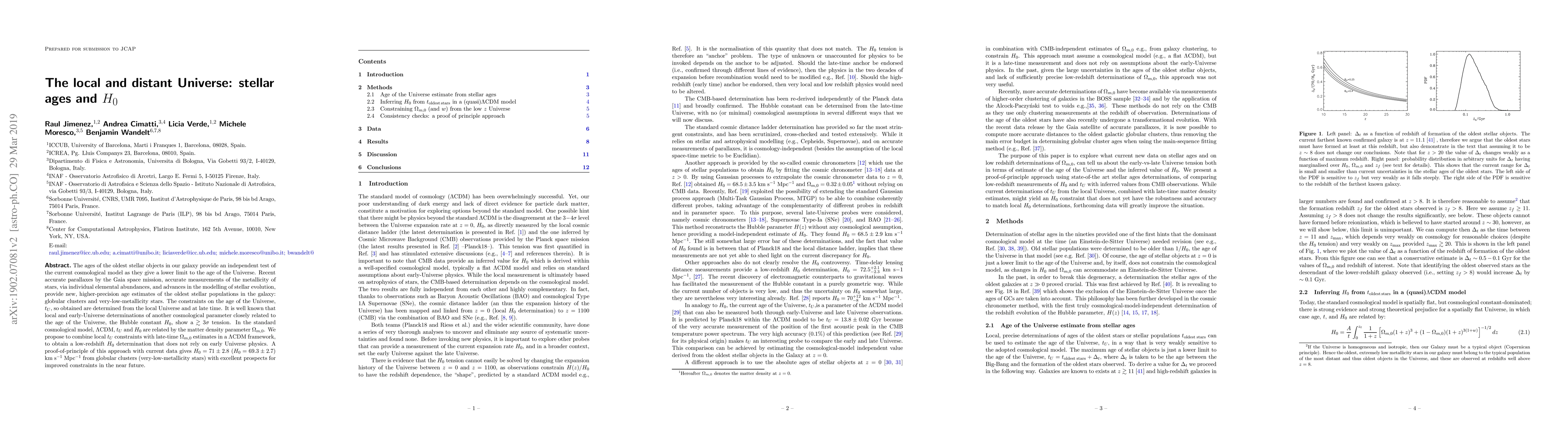 The ages of the oldest stellar objects in our galaxy provide an independent test of the current cosmological model as they give a lower limit to the age of the Universe. Recent accurate parallaxes by the Gaia space mission, accurate measurements of the metallicity of stars, via individual elemental abundances, and advances in the modelling of stellar evolution, provide new, higher-precision age estimates of the oldest stellar populations in the galaxy: globular clusters and very-low-metallicity stars. The constraints on the age of the Universe, $t_U$, so obtained are determined from the local Universe and at late time. It is well known that local and early-Universe determinations of another cosmological parameter closely related to the age of the Universe, the Hubble constant $H_0$, show a $\gtrsim 3 \sigma$ tension. In the standard cosmological model, $\Lambda$CDM, $t_U$ and $H_0$ are related by the matter density parameter $\Omega_{m,0}$. We propose to combine local $t_U$ constraints with late-time $\Omega_{m,0}$ estimates in a $\Lambda$CDM framework, to obtain a low-redshift $H_0$ determination that does not rely on early Universe physics. A proof-of-principle of this approach with current data gives $H_0=71\pm2.8$ ($H_0= 69.3 \pm 2.7$) km s$^{-1}$ Mpc$^{-1}$ from globular clusters (very-low-metallicity stars) with excellent prospects for improved constraints in the near future.