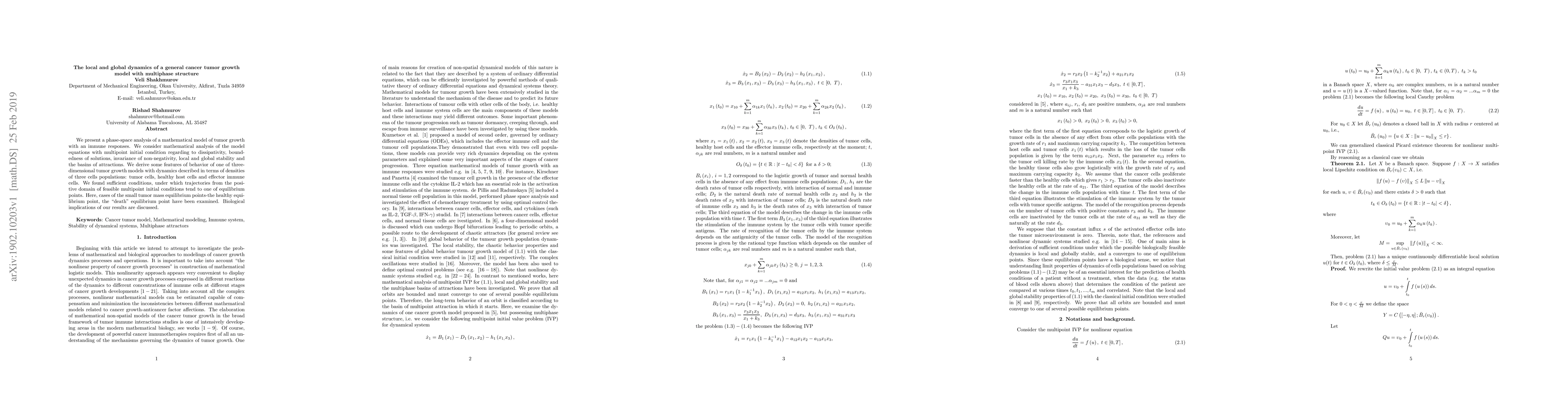 We present a phase-space analysis of a mathematical model of tumor growth with an immune responses. We consider mathematical analysis of the model equations with multipoint initial condition regarding to dissipativity, boundedness of solutions, invariance of non-negativity, local and global stability and the basins of attractions. We derive some features of behavior of one of three-dimensional tumor growth models with dynamics described in terms of densities of three cells populations: tumor cells, healthy host cells and effector immune cells. We found sufficient conditions, under which trajectories from the positive domain of feasible multipoint initial conditions tend to one of equilibrium points. Here, cases of the small tumor mass equilibrium points-the healthy equilibrium point, the "death" equilibrium point have been examined. Biological implications of our results are discussed.