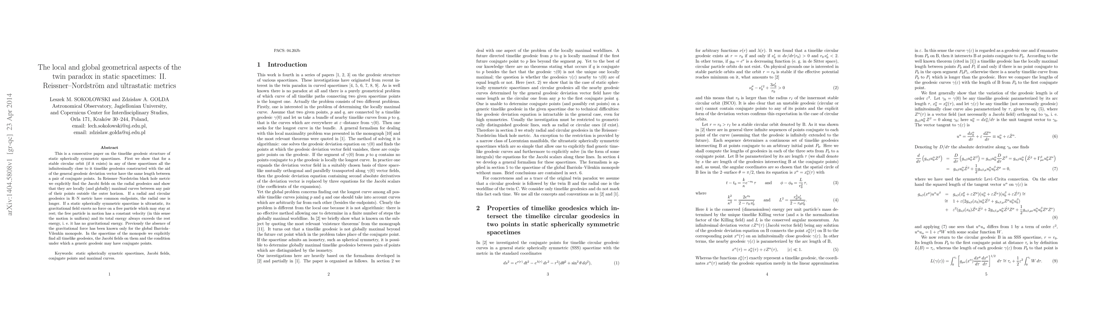 This paper investigates the geometrical aspects of the twin paradox in static spherically symmetric spacetimes, specifically focusing on Reissner-Nordström and ultrastatic metrics. It demonstrates that in Reissner-Nordström spacetime, radial geodesics are longer than circular ones if they share endpoints, and explores the unique properties of ultrastatic spacetimes where free particles experience no gravitational force.