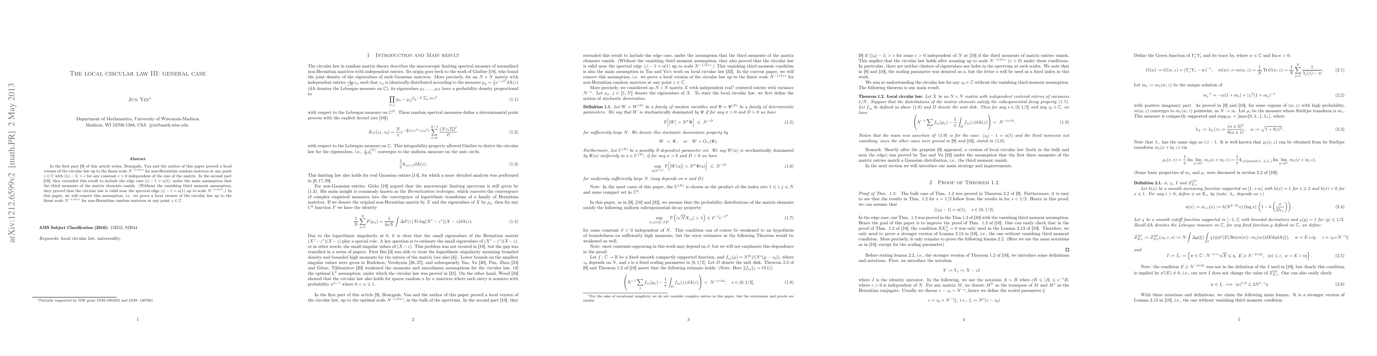 In the first part of this article series, Bourgade, Yau and the author of this paper proved a local version of the circular law up to the finest scale $N^{-1/2+ \e}$ for non-Hermitian random matrices at any point $z \in \C$ with $||z| - 1| > c $ for any $c>0$ independent of the size of the matrix. In the second part, they extended this result to include the edge case $ |z|-1=\oo(1)$, under the main assumption that the third moments of the matrix elements vanish. (Without the vanishing third moment assumption, they proved that the circular law is valid near the spectral edge $ |z|-1=\oo(1)$ up to scale $N^{-1/4+ \e}$.) In this paper, we will remove this assumption, i.e. we prove a local version of the circular law up to the finest scale $N^{-1/2+ \e}$ for non-Hermitian random matrices at any point $z \in \C$.