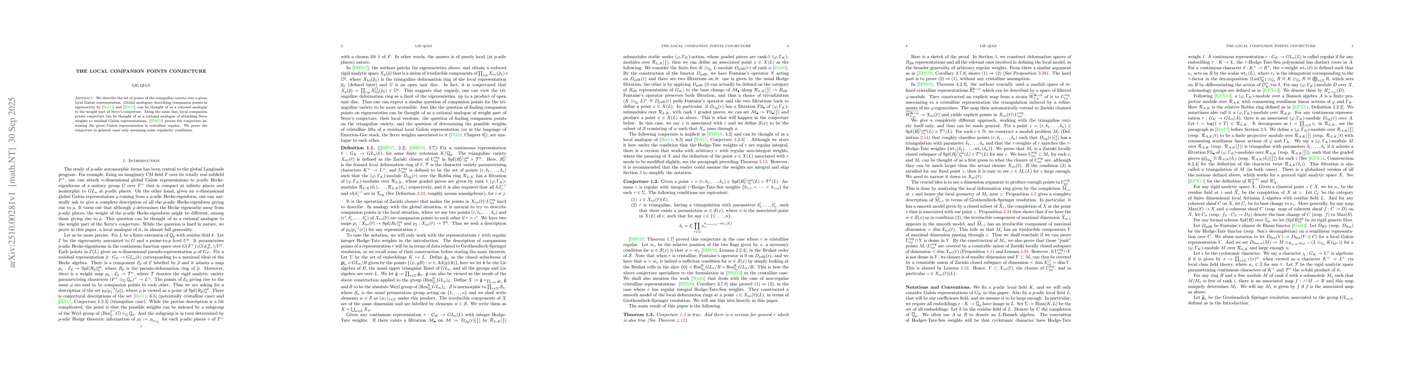We describe the set of points of the trianguline variety over a given local Galois representation. Global analogues describing companion points in eigenvariety by [Bre14] and [HN17], can be thought of as a rational analogue to the weight part of Serre's conjecture. Along the same line, local companion points conjecture can be thought of as a rational analogue of attaching Serre weights to residual Galois representations. [BHS19] proves the conjecture assuming the given Galois representation is cristalline regular. We prove the conjecture in general cases only assuming some regularity conditions.