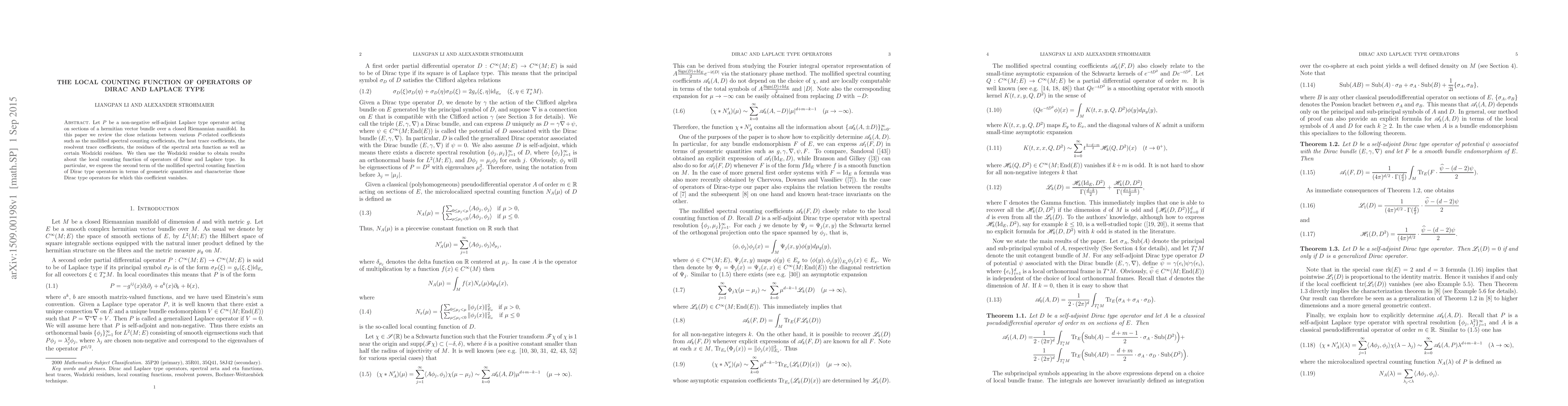 This paper explores the connections between various coefficients related to non-negative self-adjoint Laplace type operators, including the spectral counting, heat trace, and resolvent coefficients. It utilizes the Wodzicki residue to derive results on the local counting function of Dirac and Laplace type operators, specifically expressing the second term of the mollified spectral counting function for Dirac operators in terms of geometric quantities.