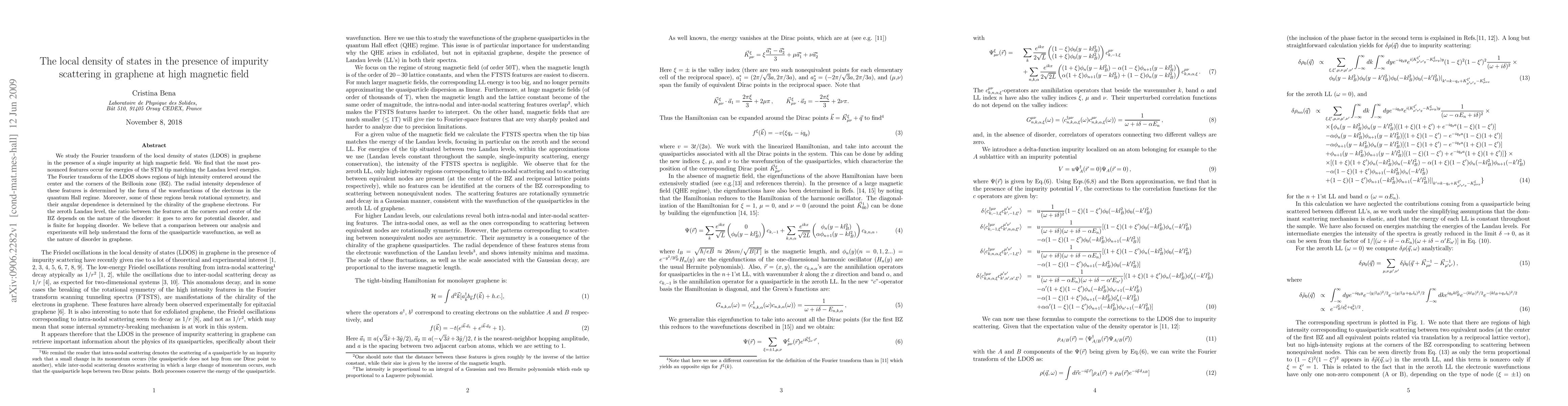 We study the Fourier transform of the local density of states (LDOS) in graphene in the presence of a single impurity at high magnetic field. We find that the most pronounced features occur for energies of the STM tip matching the Landau level energies. The Fourier transform of the LDOS shows regions of high intensity centered around the center and the corners of the Brillouin zone (BZ). The radial intensity dependence of these features is determined by the form of the wavefunctions of the electrons in the quantum Hall regime. Moreover, some of these regions break rotational symmetry, and their angular dependence is determined by the chirality of the graphene electrons. For the zeroth Landau level, the ratio between the features at the corners and center of the BZ depends on the nature of the disorder: it goes to zero for potential disorder, and is finite for hopping disorder. We believe that a comparison between our analysis and experiments will help understand the form of the quasiparticle wavefunction, as well as the nature of disorder in graphene.