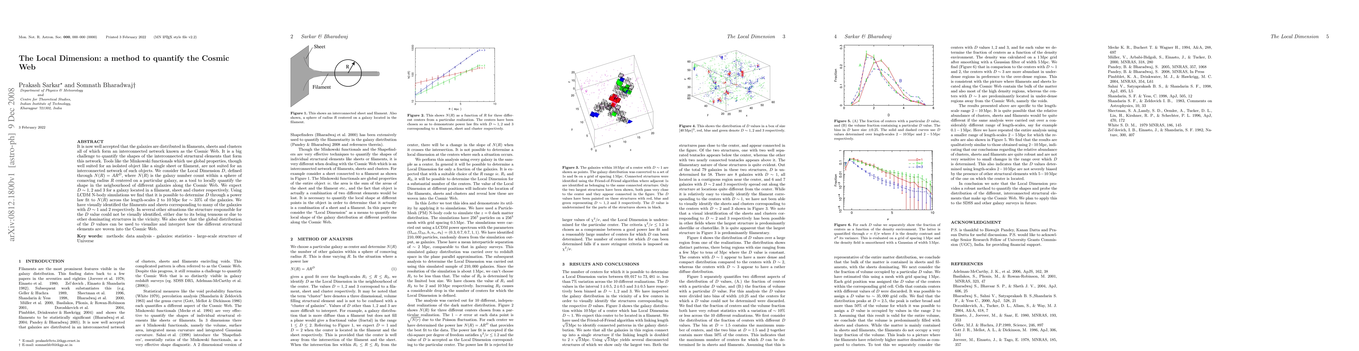 This research introduces the Local Dimension (D) as a method to quantify shapes of interconnected Cosmic Web structures, using galaxy number counts within spheres centered on galaxies. D values of ~1, 2, and 3 correspond to filaments, sheets, and clusters, respectively. Through N-body simulations, the team found D could be determined for ~33% of galaxies across 2-10 Mpc, visually linking D~1 with filaments and D~2 with sheets. The global D distribution aids in visualizing and interpreting the Cosmic Web's structural elements.