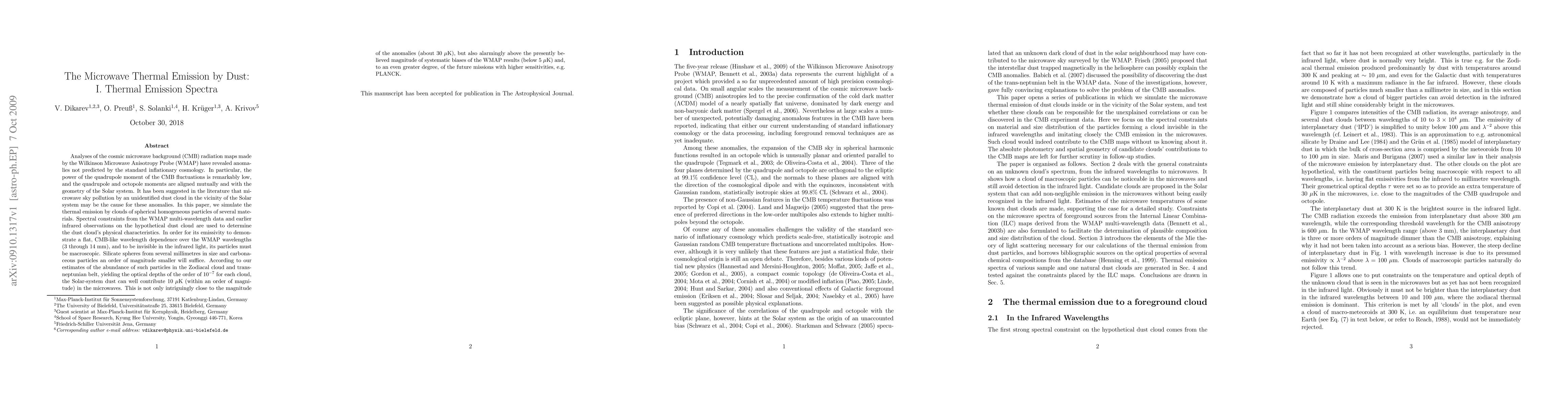 Analyses of the cosmic microwave background (CMB) radiation maps made by the Wilkinson Microwave Anisotropy Probe (WMAP) have revealed anomalies not predicted by the standard inflationary cosmology. In particular, the power of the quadrupole moment of the CMB fluctuations is remarkably low, and the quadrupole and octopole moments are aligned mutually and with the geometry of the Solar system. It has been suggested in the literature that microwave sky pollution by an unidentified dust cloud in the vicinity of the Solar system may be the cause for these anomalies. In this paper, we simulate the thermal emission by clouds of spherical homogeneous particles of several materials. Spectral constraints from the WMAP multi-wavelength data and earlier infrared observations on the hypothetical dust cloud are used to determine the dust cloud's physical characteristics. In order for its emissivity to demonstrate a flat, CMB-like wavelength dependence over the WMAP wavelengths (3 through 14 mm), and to be invisible in the infrared light, its particles must be macroscopic. Silicate spheres from several millimetres in size and carbonaceous particles an order of magnitude smaller will suffice. According to our estimates of the abundance of such particles in the Zodiacal cloud and trans-neptunian belt, yielding the optical depths of the order of 1E-7 for each cloud, the Solar-system dust can well contribute 10 microKelvin (within an order of magnitude) in the microwaves. This is not only intriguingly close to the magnitude of the anomalies (about 30 microKelvin), but also alarmingly above the presently believed magnitude of systematic biases of the WMAP results (below 5 microKelvin) and, to an even greater degree, of the future missions with higher sensitivities, e.g. PLANCK.