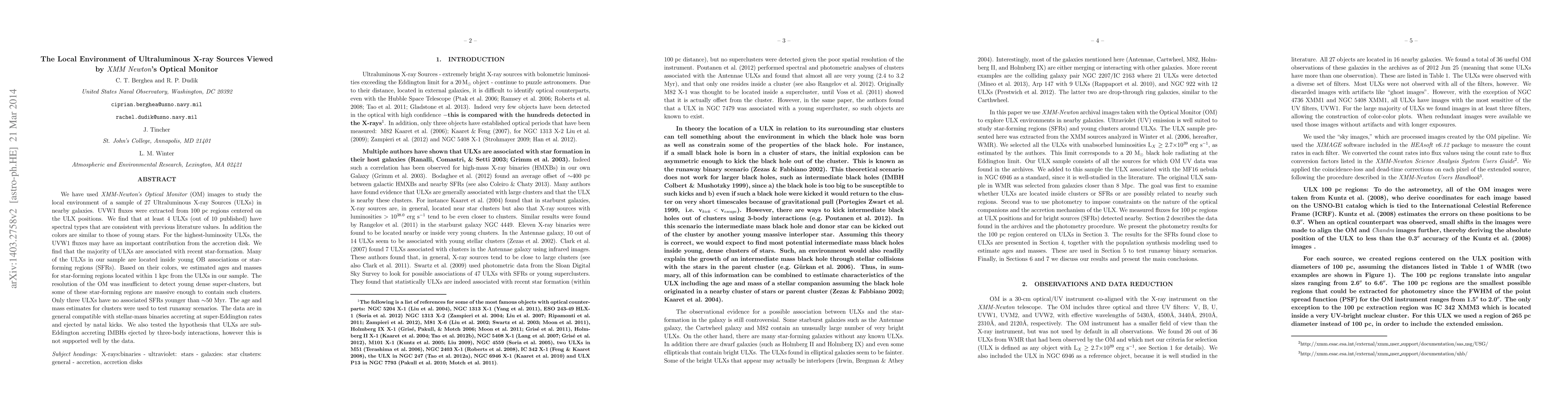 We have used XMM-Newton's Optical Monitor (OM) images to study the local environment of a sample of 27 Ultraluminous X-ray Sources (ULXs) in nearby galaxies. UVW1 fluxes were extracted from 100 pc regions centered on the ULX positions. We find that at least 4 ULXs (out of 10 published) have spectral types that are consistent with previous literature values. In addition the colors are similar to those of young stars. For the highest-luminosity ULXs, the UVW1 fluxes may have an important contribution from the accretion disk. We find that the majority of ULXs are associated with recent star-formation. Many of the ULXs in our sample are located inside young OB associations or star-forming regions (SFRs). Based on their colors, we estimated ages and masses for star-forming regions located within 1 kpc from the ULXs in our sample. The resolution of the OM was insufficient to detect young dense super-clusters, but some of these star-forming regions are massive enough to contain such clusters. Only three ULXs have no associated SFRs younger than 50 Myr. The age and mass estimates for clusters were used to test runaway scenarios. The data are in general compatible with stellar-mass binaries accreting at super-Eddington rates and ejected by natal kicks. We also tested the hypothesis that ULXs are sub-Eddington accreting IMBHs ejected by three-body interactions, however this is not supported well by the data.