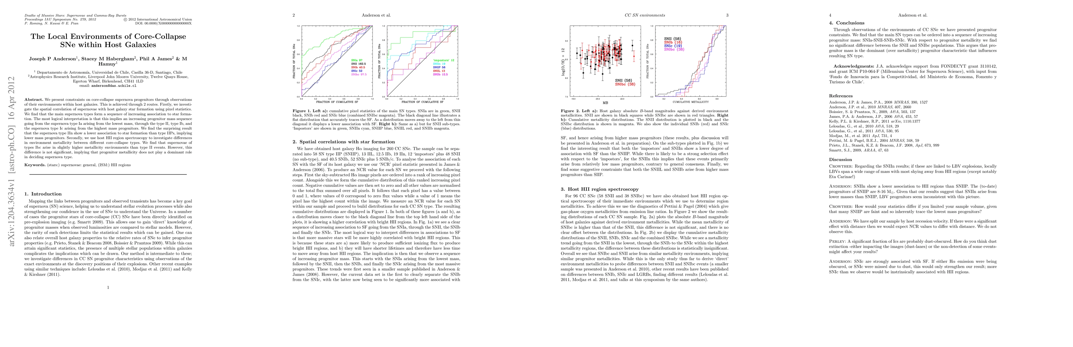 This paper investigates the local environments of core-collapse supernovae within host galaxies, revealing a sequence of increasing association with star formation correlating to progenitor mass and finding that type IIn supernovae have lower associations with star formation than type IIPs, suggesting lower mass progenitors. Additionally, it shows that type Ibc supernovae occur in slightly higher metallicity environments than type II, though metallicity is not a dominant factor.