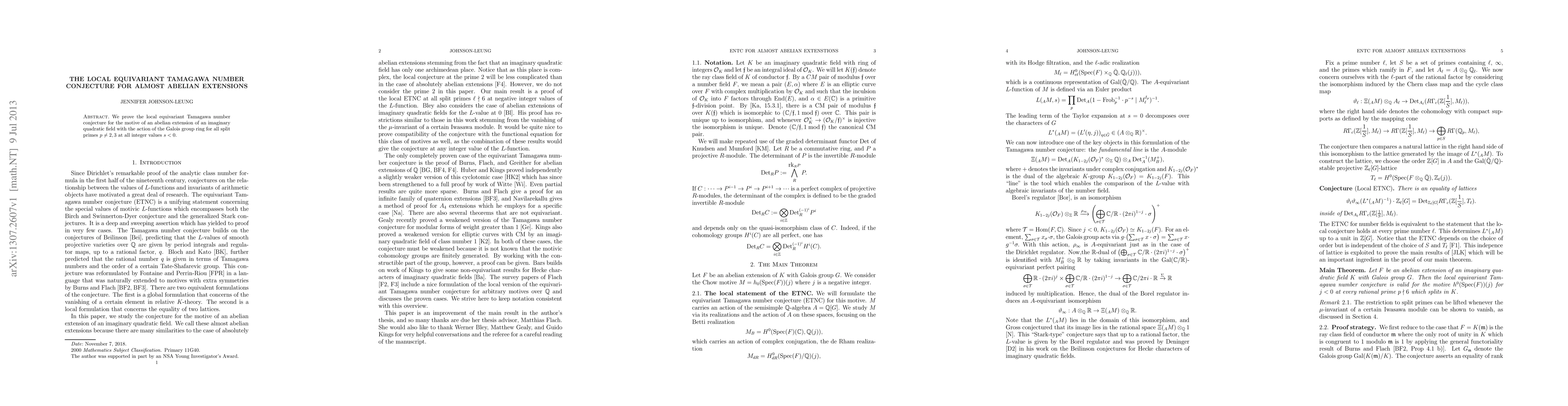 The paper proves the local equivariant Tamagawa number conjecture for abelian extensions of imaginary quadratic fields at all split primes p ≠ 2, 3 for all negative integer values of s. This addresses the motive of the extensions under the action of the Galois group ring.