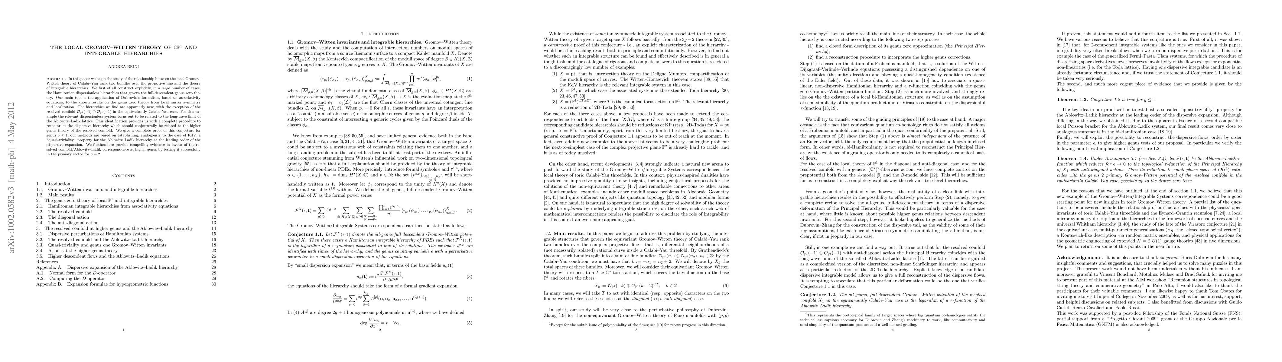 This paper investigates the link between local Gromov-Witten theory of Calabi-Yau bundles over CP^1 and integrable hierarchies, constructing new Hamiltonian dispersionless hierarchies via Dubrovin's formalism. It identifies these hierarchies with the long-wave limit of the Ablowitz-Ladik lattice for the resolved conifold, confirming the correspondence for genus g≤1 and providing evidence for higher genus.