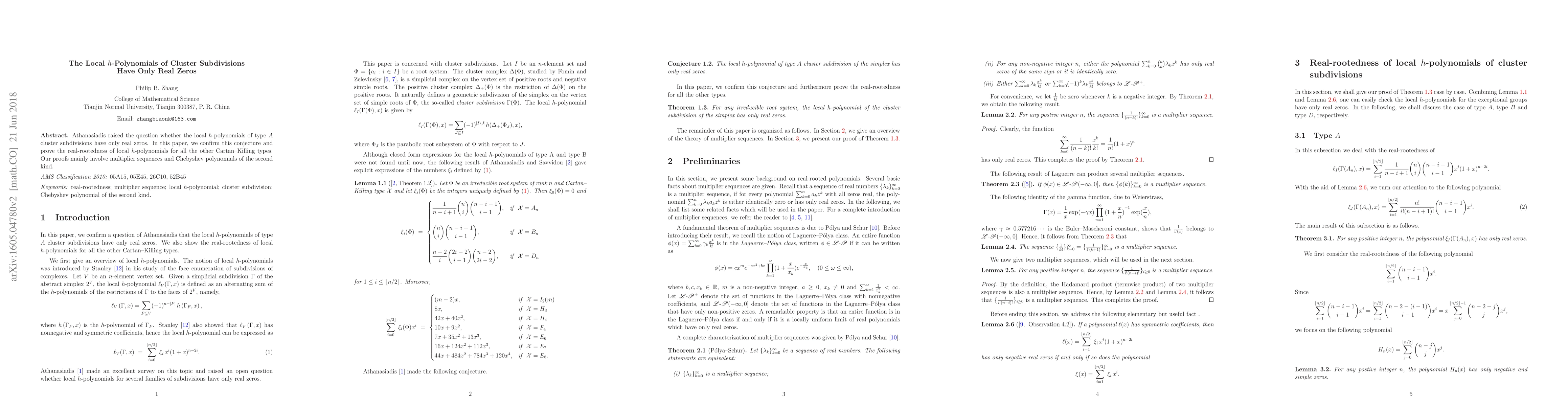 This paper confirms Athanasiadis' conjecture that the local $h$-polynomials of type $A$ cluster subdivisions have only real zeros and extends the result to all Cartan--Killing types, utilizing multiplier sequences and Chebyshev polynomials of the second kind.