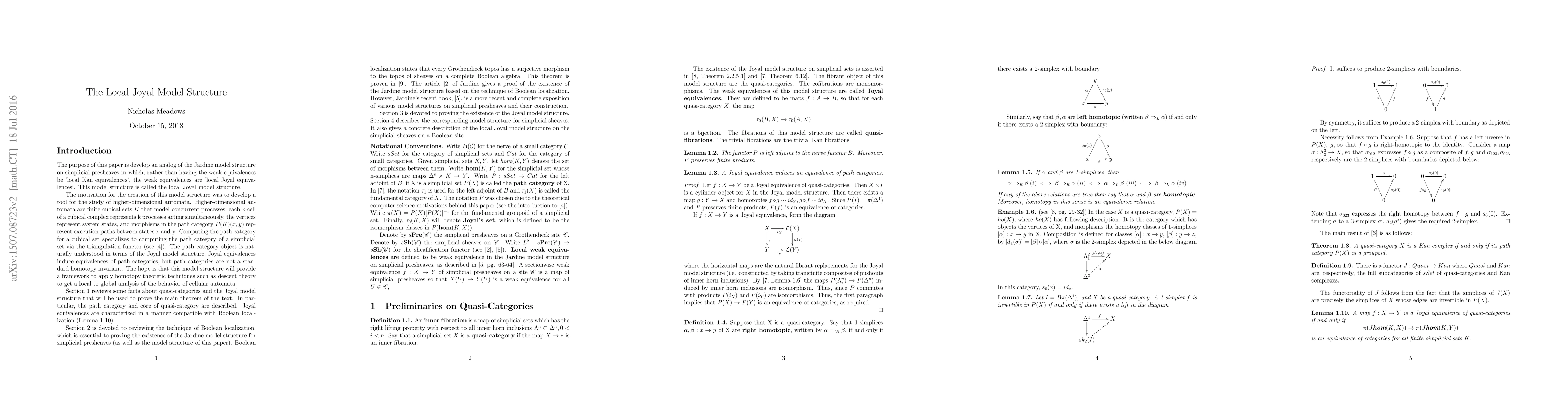 Summary: The paper demonstrates an extension of the Joyal quasi-category model structure to simplicial presheaves, where the weak equivalences correspond to local Joyal equivalences. This local model retains the essential features of the original Joyal model.