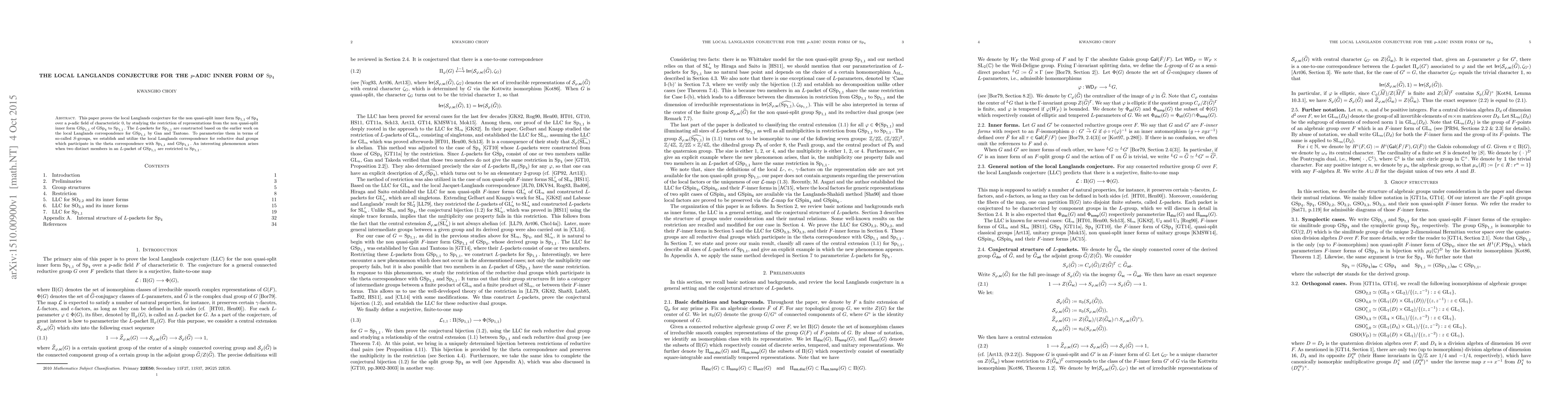 This paper proves the local Langlands conjecture for the non quasi-split inner form Sp(1,1) of Sp(4) over a p-adic field of characteristic 0, by studying the restriction of representations from the non quasi-split inner form GSp(1,1) of GSp(4) to Sp(1,1). The L-packets for Sp(1,1) are constructed based on the earlier work on the local Langlands correspondence for GSp(1,1) by Gan and Tantono. To parameterize them in terms of so-called S-groups, we establish and utilize the local Langlands correspondence for reductive dual groups which participate in the theta correspondence with Sp(1,1) and GSp(1,1). An interesting phenomenon arises when two distinct members in an L-packet of GSp(1,1) are restricted to Sp(1,1).