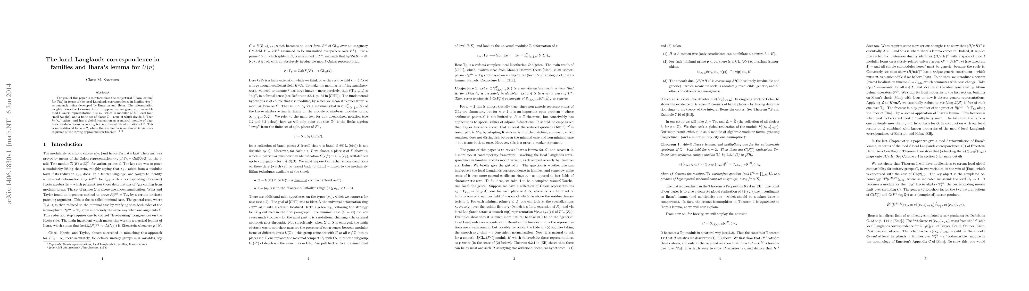 The goal of this paper is to reformulate the conjectural "Ihara lemma" for $U(n)$ in terms of the local Langlands correspondence in families $\tilde{\pi}_{\Sigma}(\cdot)$, as currently being developed by Emerton and Helm. The reformulation roughly takes the following form. Suppose we are given an irreducible mod $\ell$ Galois representation $\bar{r}$, which is modular of full level (and small weight), and a finite set of places $\Sigma$ -- none of which divide $\ell$. Then $\tilde{\pi}_{\Sigma}(r)$ exists, and has a global realization as a natural module of algebraic modular forms, where $r$ is the universal $\Sigma$-deformation of $\bar{r}$. This is unconditional for $n=2$, where Ihara's lemma is an almost trivial consequence of the strong approximation theorem.