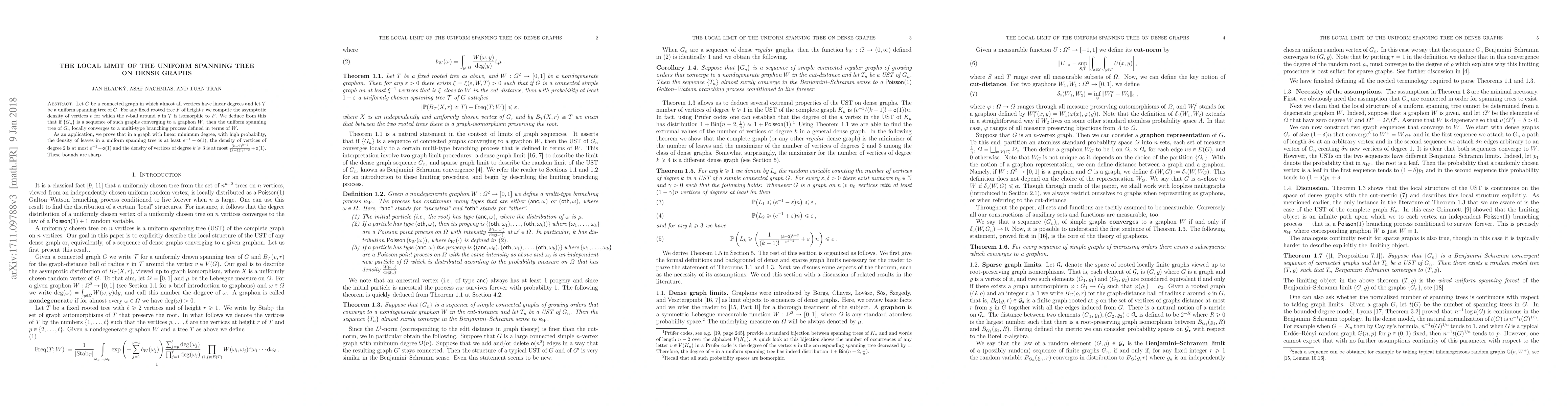 Let $G$ be a connected graph in which almost all vertices have linear degrees and let $T$ be a uniform spanning tree of $G$. For any fixed rooted tree $F$ of height $r$ we compute the asymptotic density of vertices $v$ for which the $r$-ball around $v$ in $T$ is isomorphic to $F$. We deduce from this that if $\{G_n\}$ is a sequence of such graphs converging to a graphon $W$, then the uniform spanning tree of $G_n$ locally converges to a multi-type branching process defined in terms of $W$. As an application, we prove that in a graph with linear minimum degree, with high probability, the density of leaves in a uniform spanning tree is at least $1/e-o(1)$, the density of vertices of degree $2$ is at most $1/e+o(1)$ and the density of vertices of degree $k\geq 3$ is at most ${(k-2)^{k-2} \over (k-1)! e^{k-2}} + o(1)$. These bounds are sharp.