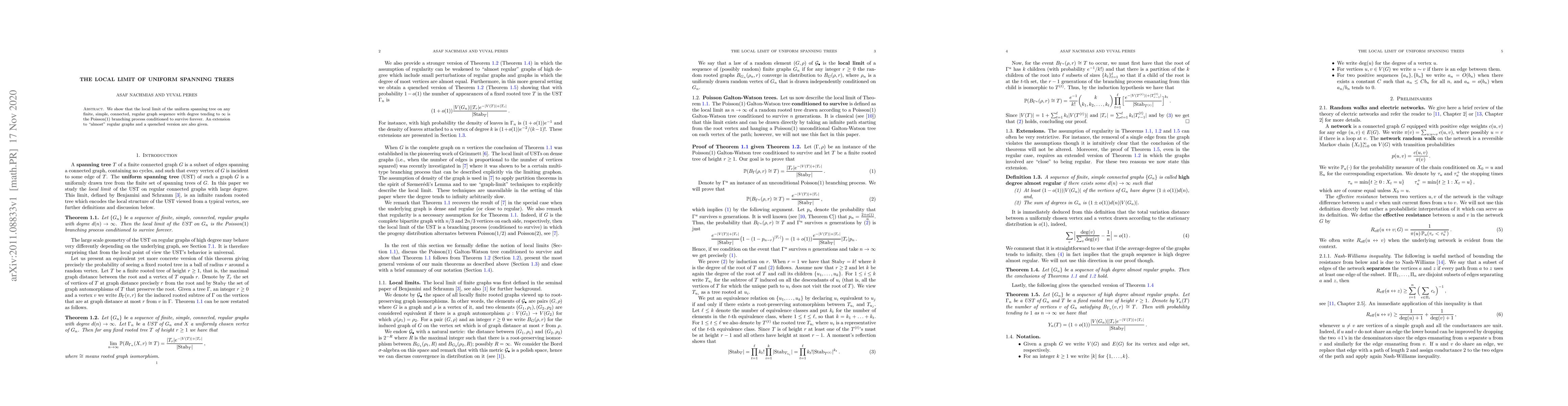 Summary: The paper demonstrates that the local limit of uniform spanning trees on large, regular graphs converges to a Poisson(1) branching process that survives indefinitely. It also extends this result to "almost" regular graphs and includes a quenched version.