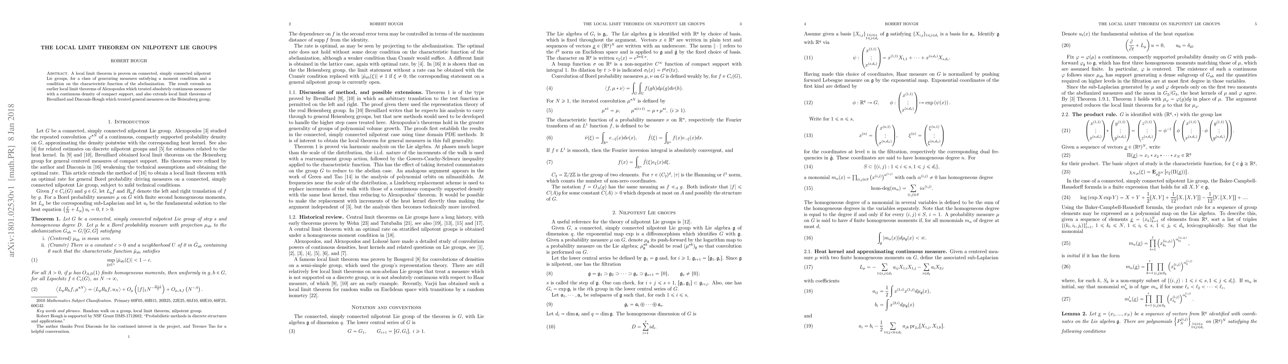 This paper proves a local limit theorem for generating measures on connected, simply connected nilpotent Lie groups, extending previous results by Alexopoulos, Breuillard, and Diaconis-Hough. The theorem applies to measures satisfying specific moment and characteristic conditions.