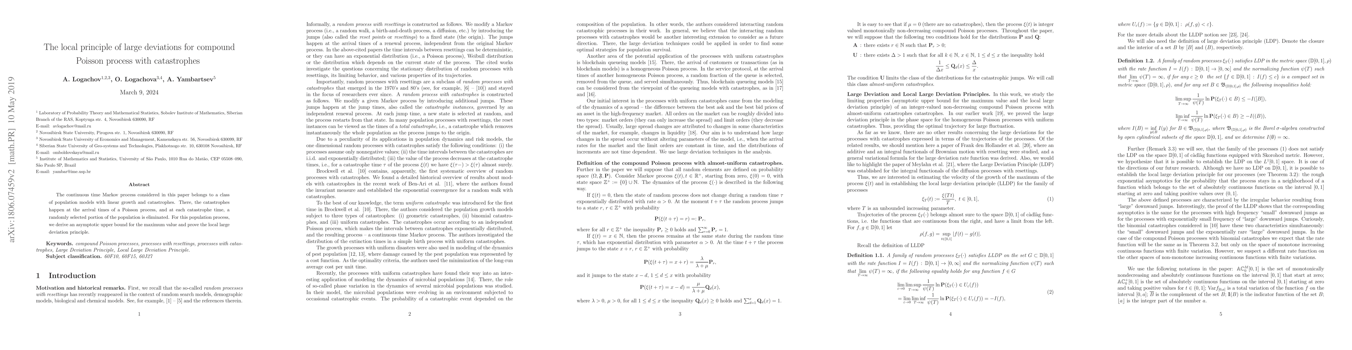 This paper studies a continuous time Markov process representing a population model with linear growth interrupted by catastrophes occurring at Poisson process times. It derives an asymptotic upper bound for the maximum value and proves the local large deviation principle for this compound Poisson process with catastrophes.