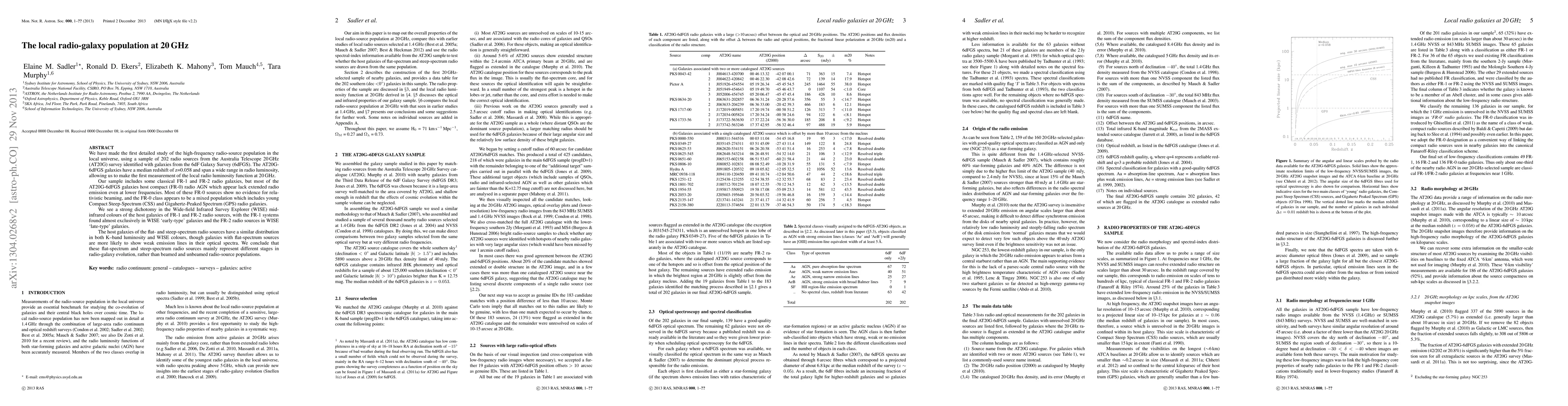 We have made the first detailed study of the high-frequency radio-source population in the local universe, using a sample of 202 radio sources from the Australia Telescope 20 GHz (AT20G) survey identified with galaxies from the 6dF Galaxy Survey (6dFGS). The AT20G-6dFGS galaxies have a median redshift of z=0.058 and span a wide range in radio luminosity, allowing us to make the first measurement of the local radio luminosity function at 20 GHz. Our sample includes some classical FR-1 and FR-2 radio galaxies, but most of the AT20G-6dFGS galaxies host compact (FR-0) radio AGN which appear lack extended radio emission even at lower frequencies. Most of these FR-0 sources show no evidence for relativistic beaming, and the FR-0 class appears to be a mixed population which includes young Compact Steep-Spectrum (CSS) and Gigahertz-Peaked Spectrum (GPS) radio galaxies. We see a strong dichotomy in the Wide-field Infrared Survey Explorer (WISE) mid-infrared colours of the host galaxies of FR-1 and FR-2 radio sources, with the FR-1 systems found almost exclusively in WISE `early-type' galaxies and the FR-2 radio sources in WISE `late-type' galaxies. The host galaxies of the flat- and steep-spectrum radio sources have a similar distribution in both K--band luminosity and WISE colours, though galaxies with flat-spectrum sources are more likely to show weak emission lines in their optical spectra. We conclude that these flat-spectrum and steep-spectrum radio sources mainly represent different stages in radio-galaxy evolution, rather than beamed and unbeamed radio-source populations.