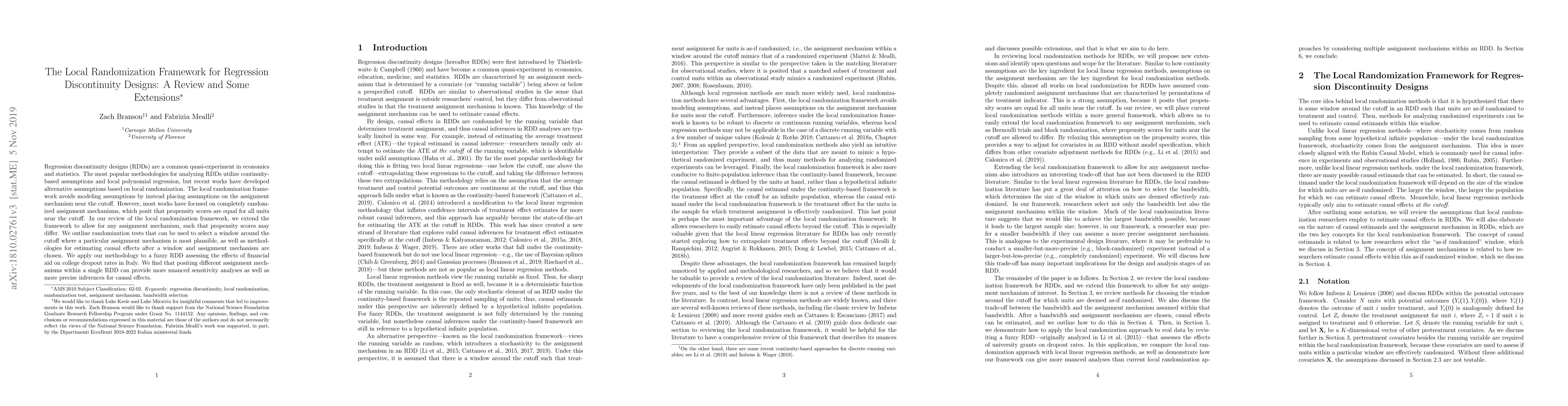 This paper reviews the local randomization framework for regression discontinuity designs (RDDs) and extends it to accommodate various assignment mechanisms, allowing for differing propensity scores. It proposes randomization tests to select optimal windows and methodologies for estimating causal effects, demonstrating its application in analyzing the impact of financial aid on college dropout rates in Italy.