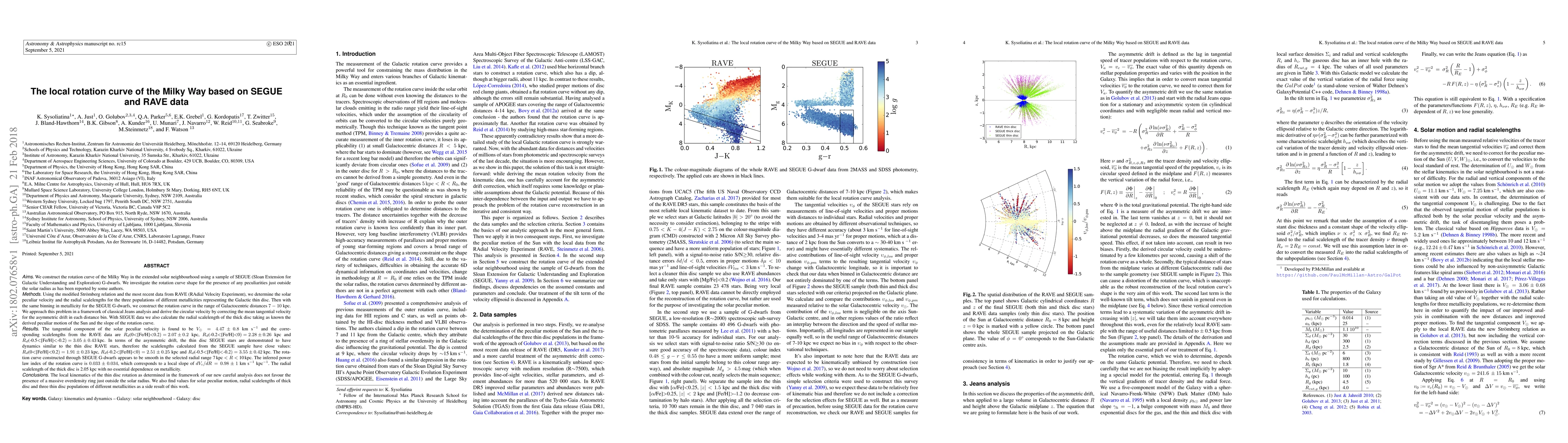 We construct the rotation curve of the Milky Way in the extended solar neighbourhood using a sample of SEGUE (Sloan Extension for Galactic Understanding and Exploration) G-dwarfs. We investigate the rotation curve shape for the presence of any peculiarities just outside the solar radius as has been reported by some authors. We approach the problem in a framework of classical Jeans analysis. Using the most recent data from RAVE (RAdial Velocity Experiment), we determine the solar peculiar velocity and the radial scalelengths for the three populations of different metallicities representing the Galactic thin disc. Then with the same binning in metallicity for the SEGUE G-dwarfs, we construct the rotation curve in the range of Galactocentric distances 7-10 kpc. We derive the circular velocity by correcting the mean tangential velocity for the asymmetric drift in each distance bin. With SEGUE data we also calculate the radial scalelength of the thick disc taking as known the derived peculiar motion of the Sun and the slope of the rotation curve. The rotation curve constructed through SEGUE G-dwarfs appears to be smooth in the selected radial range. The local kinematics of the thin disc rotation as determined in the framework of our new careful analysis does not favour the presence of a massive overdensity ring just outside the solar radius.
