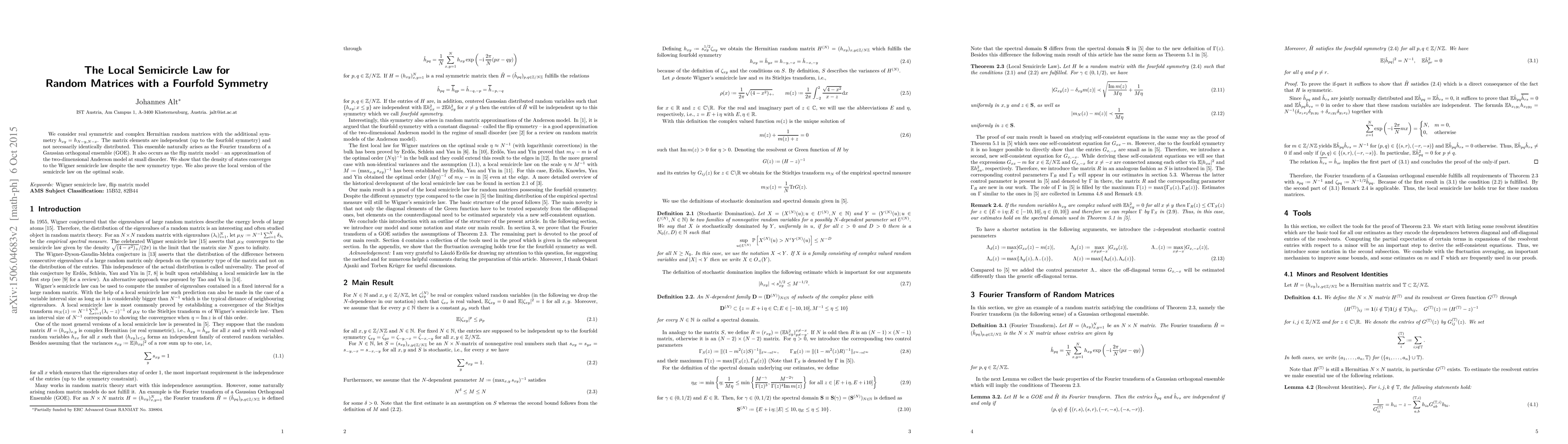 The paper investigates random matrices with a fourfold symmetry, showing that despite this symmetry, the density of states converges to the Wigner semicircle law. It also proves the local semicircle law on the optimal scale for this ensemble.