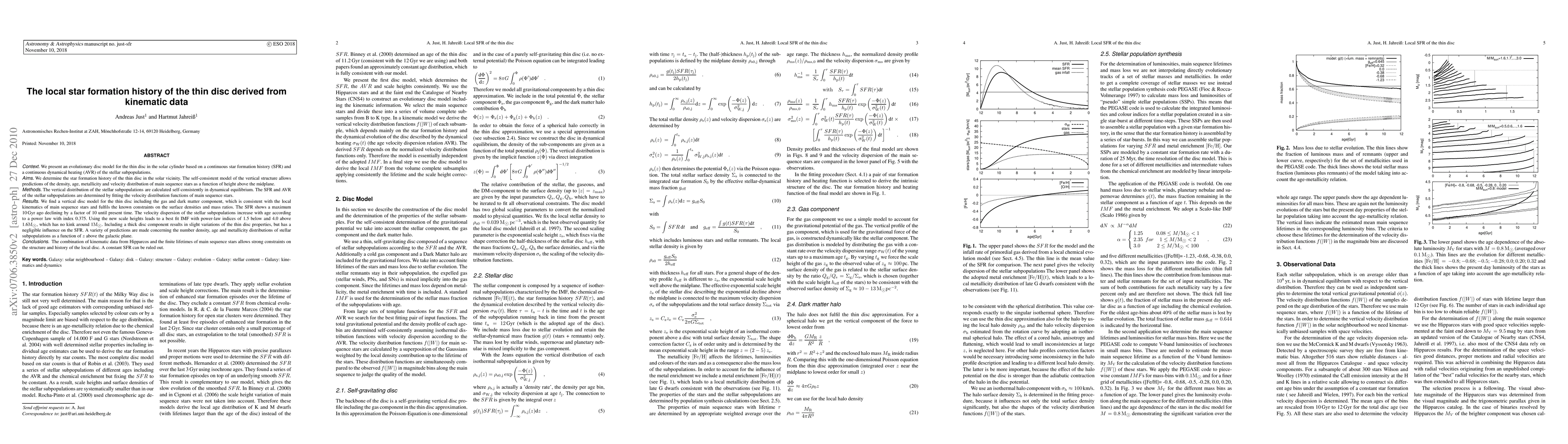 We present an evolutionary disc model for the thin disc in the solar cylinder based on a continuous star formation history and a continuous dynamical heating of the stellar subpopulations. The vertical distribution of the stellar subpopulations are calculated self-consistently in dynamical equilibrium. The SFR and AVR of the stellar subpopulations are determined by fitting the velocity distribution functions of main sequence stars. The SFR shows a maximum 10 Gyr ago declining by a factor of 10 until present time. A constant SFR can be ruled out. The velocity dispersion of the stellar subpopulations increase with age according to a power law with index 0.375. The new scale heights lead to a best fit IMF with power-law indices of 1.5 below and 4.0 above 1.6 Msun, which has no kink around 1 Msun. Including a thick disc component results in slight variations of the thin disc properties, but has a negligible influence on the SFR. A variety of predictions are made concerning the number density, age and metallicity distributions of stellar subpopulations as a function of z above the galactic plane.