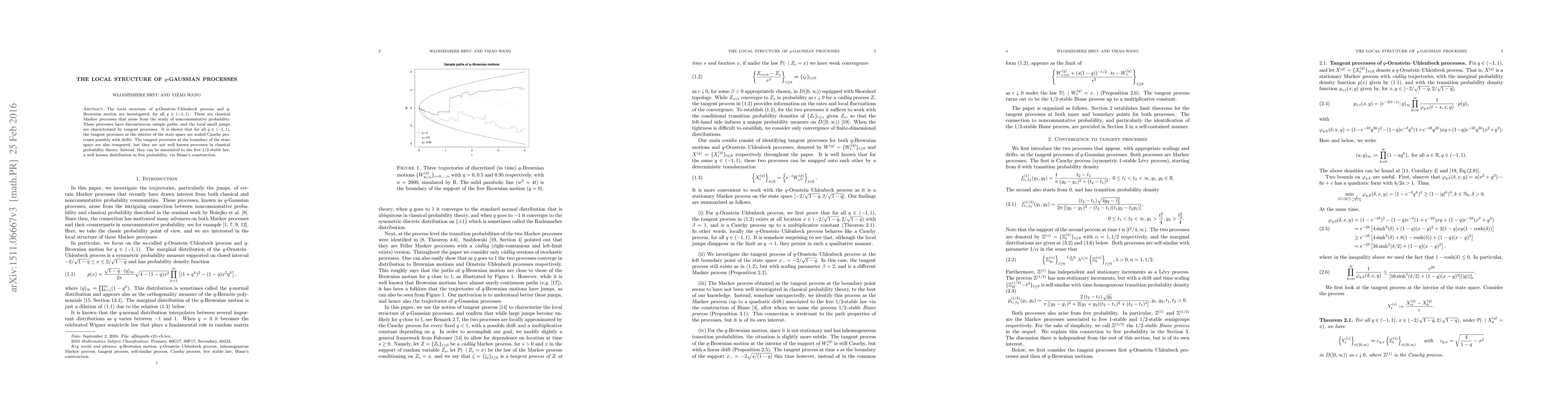 The local structure of $q$-Ornstein-Uhlenbeck processes and $q$-Brownian motions are investigated, for all $q\in(-1,1)$. These are the classical Markov processes corresponding to the noncommutative $q$-Gaussian processes. These processes have discontinuous sample paths, and the local small jumps are characterized by tangent processes. It is shown that for all $q\in(-1,1)$, the tangent processes at inner domain are scaled Cauchy processes possibly with drifts, and the tangent processes at the boundary of the domain are related to the free $1/2$-stable law via Biane's construction.