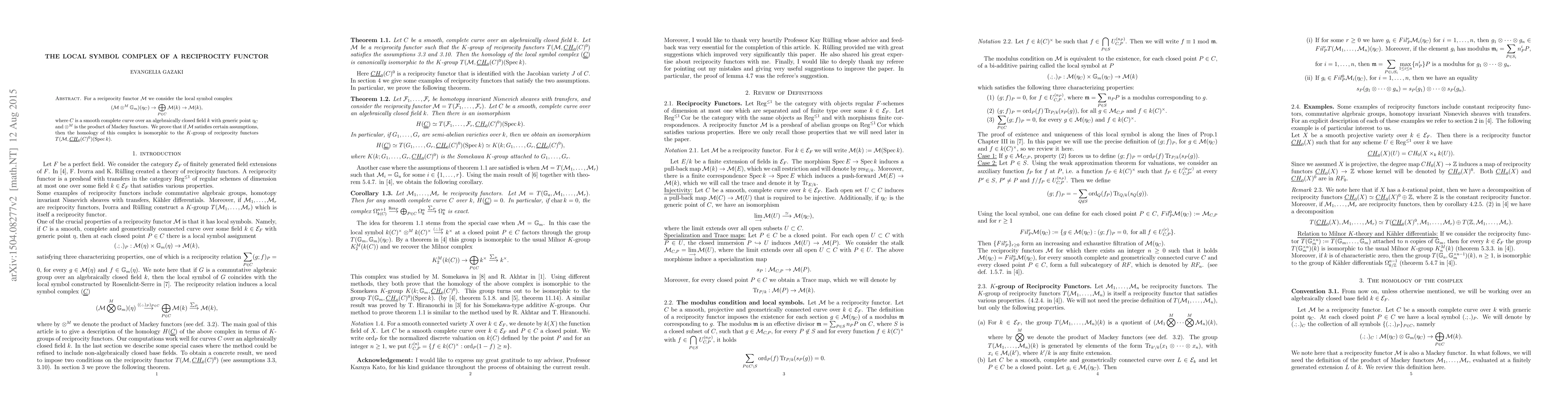 Title: The local symbol complex of a Reciprocity Functor Summary: This paper studies the local symbol complex for a reciprocity functor $\mathcal{M}$ and proves that under certain conditions, its homology is isomorphic to the $K$-group of reciprocity functors associated with the curve $C$.