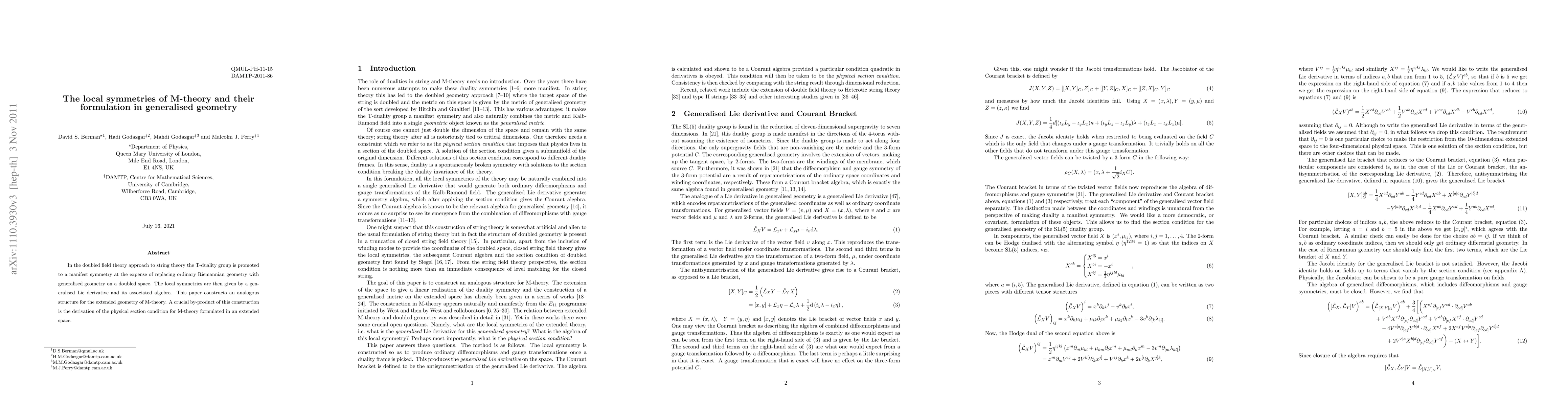 In the doubled field theory approach to string theory, the T-duality group is promoted to a manifest symmetry at the expense of replacing ordinary Riemannian geometry with generalised geometry on a doubled space. The local symmetries are then given by a generalised Lie derivative and its associated algebra. This paper constructs an analogous structure for M-theory. A crucial by-product of this is the derivation of the physical section condition for M-theory formulated in an extended space.