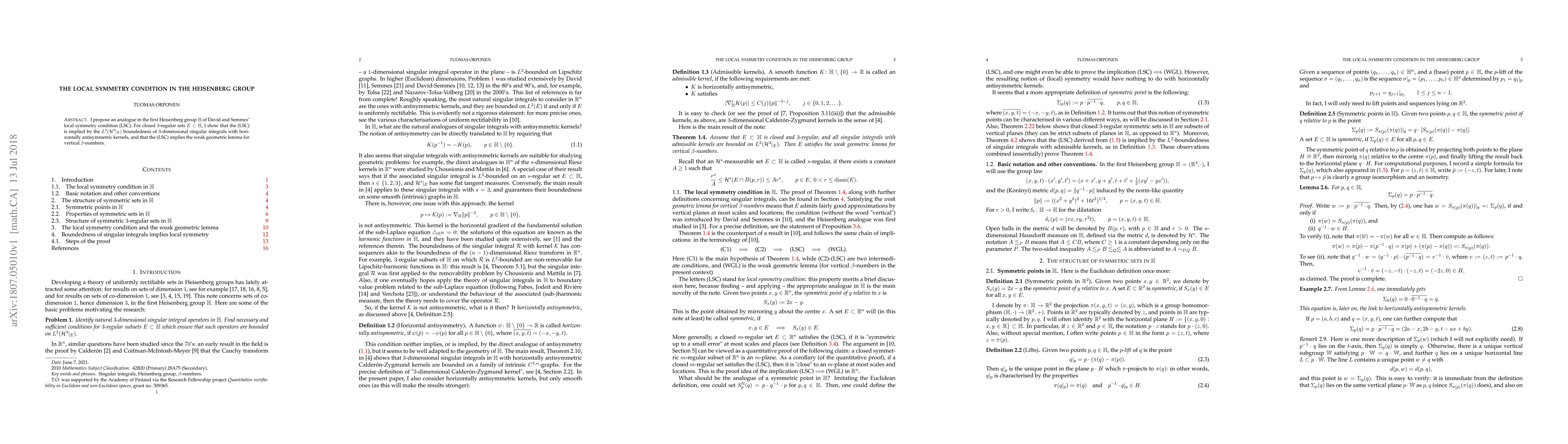 I propose an analogue in the first Heisenberg group $\mathbb{H}$ of David and Semmes' local symmetry condition (LSC). For closed $3$-regular sets $E \subset \mathbb{H}$, I show that the (LSC) is implied by the $L^{2}(\mathcal{H}^{3}|_{E})$ boundedness of $3$-dimensional singular integrals with horizontally antisymmetric kernels, and that the (LSC) implies the weak geometric lemma for vertical $\beta$-numbers.