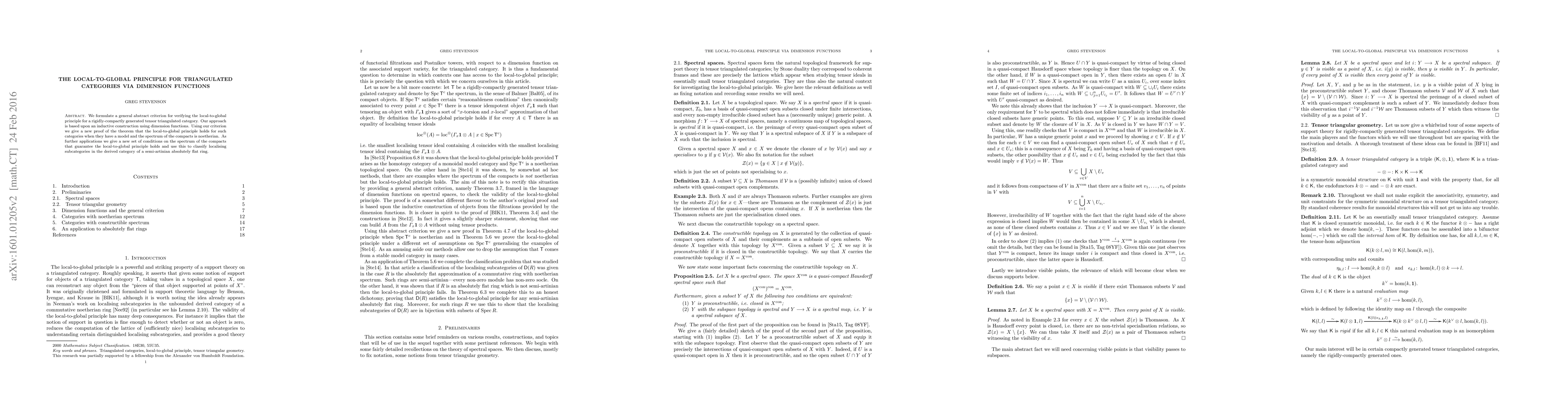 This paper establishes an abstract criterion for verifying the local-to-global principle in rigidly-compactly generated tensor triangulated categories, employing dimension functions for an inductive construction. It provides a new proof for the local-to-global principle in such categories when they have a model and the spectrum of compacts is Noetherian, and classifies localizing subcategories in the derived category of semi-artinian absolutely flat rings.