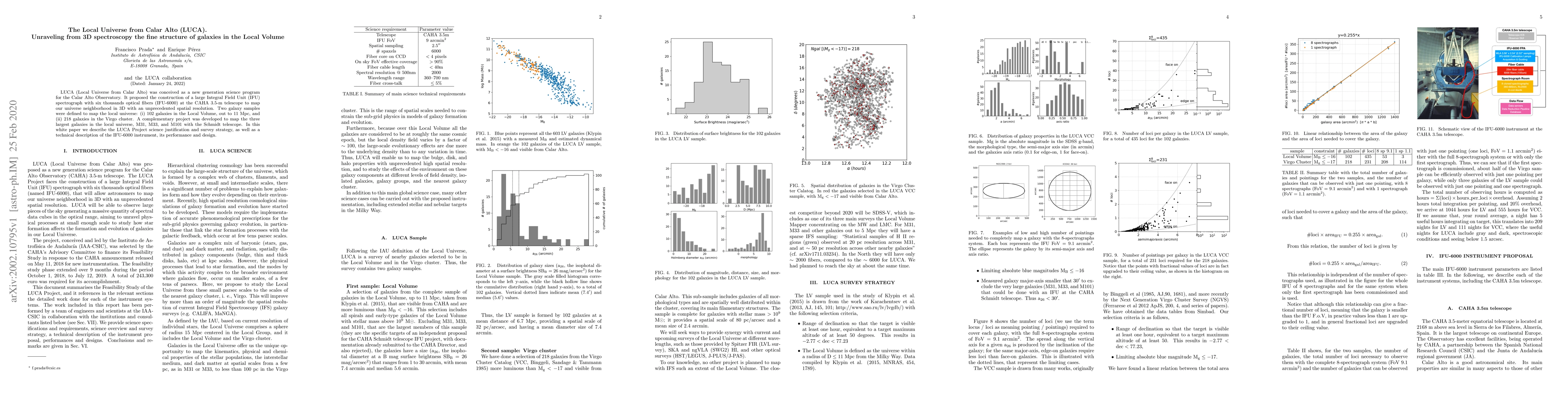 The LUCA project aims to map the local universe in 3D using a new IFU spectrograph with 6,000 optical fibers at the Calar Alto Observatory, focusing on 320 galaxies in the Local Volume and Virgo cluster, and three large galaxies. The paper details the scientific goals, survey strategy, and technical specifications of the IFU-6000 instrument.