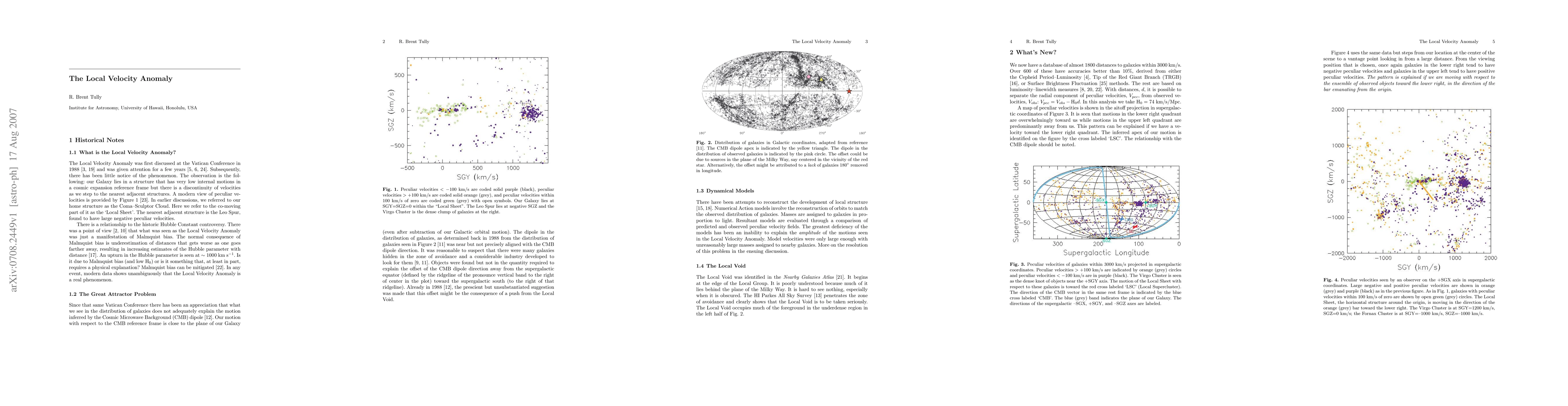 The Local Velocity Anomaly reveals a significant velocity discontinuity of 7 Mpc between galaxies in the Local Sheet and adjacent structures, with the Local Sheet exhibiting a peculiar velocity of 260 km/s away from the Local Void, suggesting the void must be large and nearly empty to account for this motion.