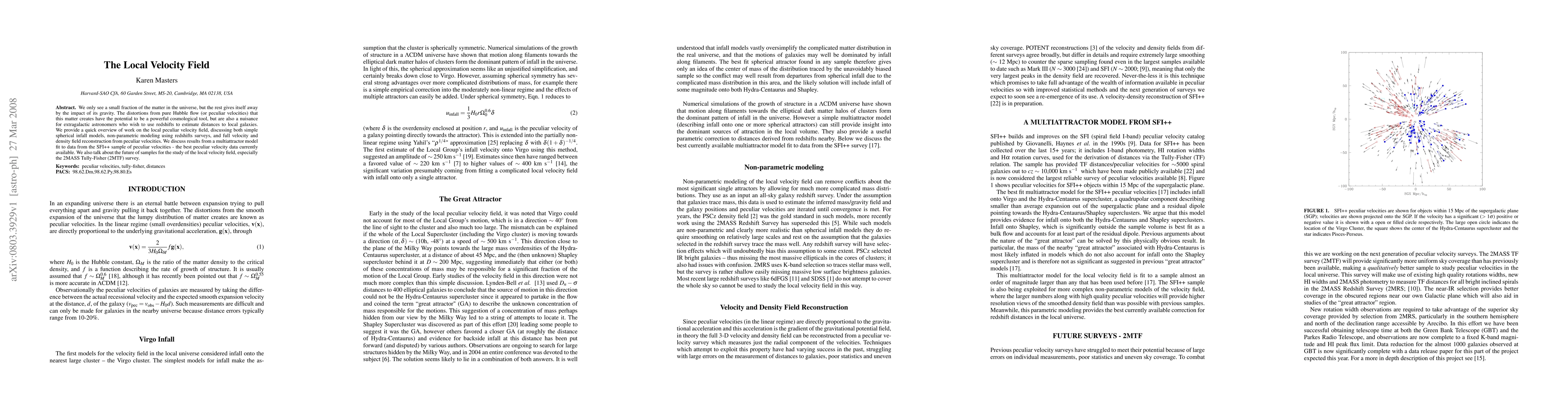 We only see a small fraction of the matter in the universe, but the rest gives itself away by the impact of its gravity. The distortions from pure Hubble flow (or peculiar velocities) that this matter creates have the potential to be a powerful cosmological tool, but are also a nuisance for extragalactic astronomers who wish to use redshifts to estimate distances to local galaxies. We provide a quick overview of work on the local peculiar velocity field, discussing both simple spherical infall models, non-parametric modeling using redshifts surveys, and full velocity and density field reconstruction from peculiar velocities. We discuss results from a multiattractor model fit to data from the SFI++ sample of peculiar velocities - the best peculiar velocity data currently available. We also talk about the future of samples for the study of the local velocity field, especially the 2MASS Tully-Fisher (2MTF) survey.