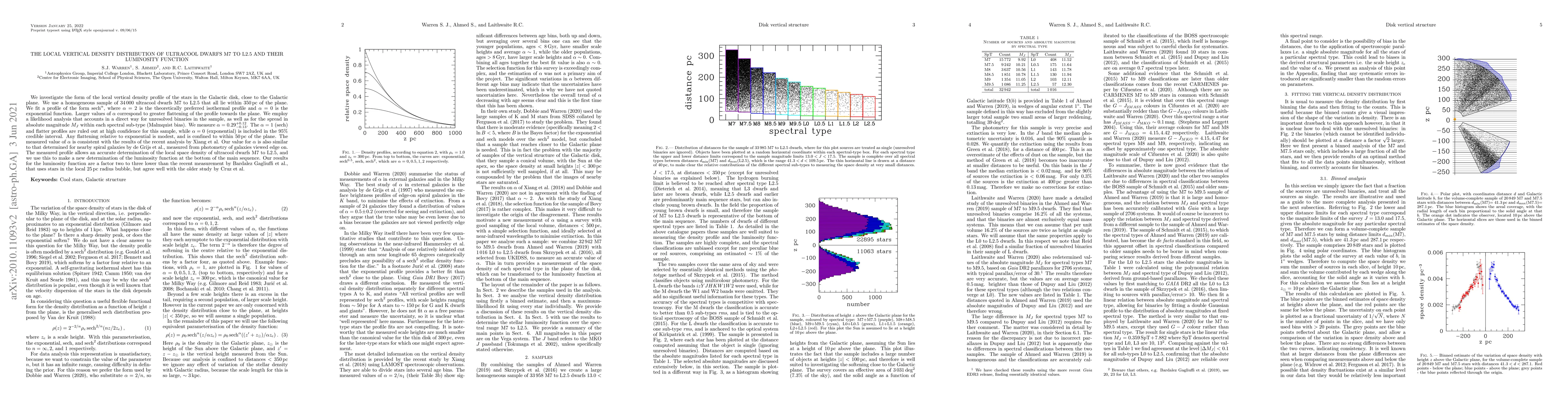 This paper investigates the local vertical density profile of ultracool dwarfs M7 to L2.5 within 350 pc of the Galactic plane, finding a modest flattening with $\alpha=0.29^{+0.12}_{-0.13}$. The study also revises the luminosity function, reporting values a factor two to three lower than recent measurements but consistent with older studies.