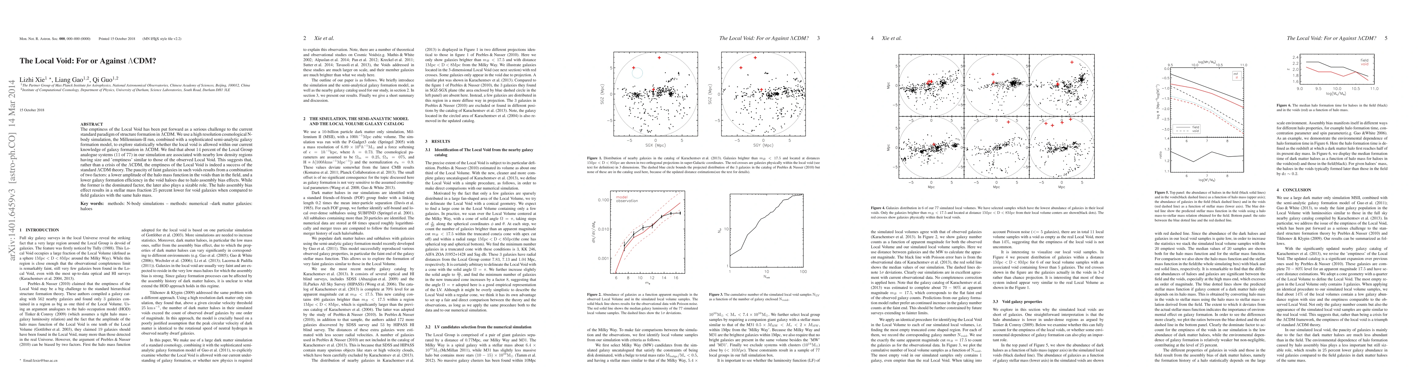 The Local Void's emptiness aligns with predictions from the LCDM model, as simulations show 15% of Local Group analogues exhibit similar low-density regions. The scarcity of faint galaxies is due to lower halo mass function amplitude and reduced galaxy formation efficiency in voids.