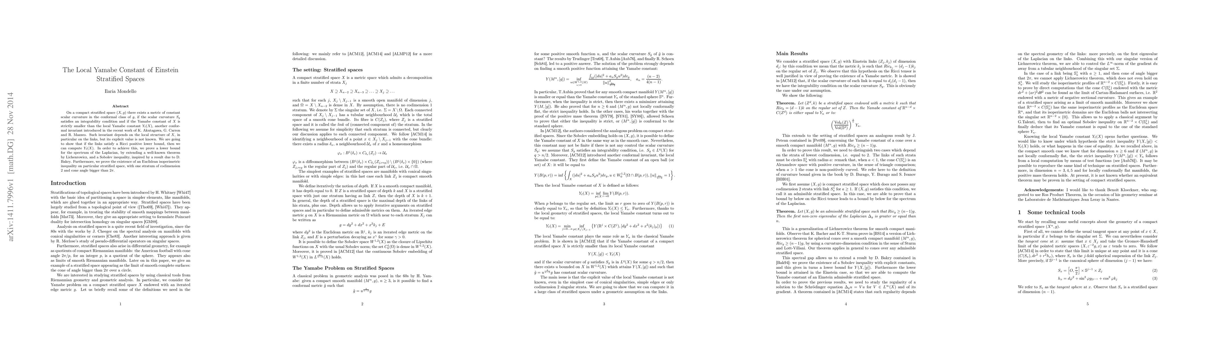 On a compact stratified space (X, g) there exists a metric of constant scalar curvature in the conformal class of g, if the scalar curvature satisfies an integrability condition and if the Yamabe constant of X is strictly smaller than the local Yamabe constant , another conformal invariant introduced in the recent work of K. Akutagawa, G. Carron and R. Mazzeo. Such invariant depends on the local structure of X, in particular on the links, but its explicit value is not known. We are going to show that if the links satisfy a Ricci positive lower bound, then we can compute the local Yamabe constant. In order to achieve this, we prove a lower bound for the spectrum of the Laplacian, by extending a well-known theorem by Lichenrowicz, and a Sobolev inequality, inspired by a result due to D. Bakry. Furthermore, we prove the existence of an Euclidean isoperimetric inequality on particular stratified space, with one stratum of codimension 2 and cone angle bigger than 2$\pi$.