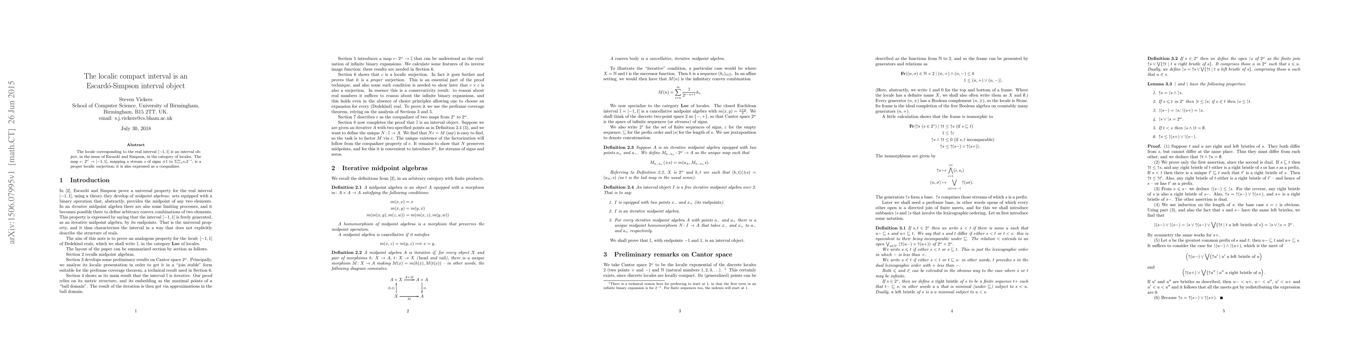 This research establishes that the locale associated with the real interval [-1,1] functions as an interval object in the category of locales. It confirms that the map 'c' from 2^omega to [-1,1] is a proper localic surjection, expressed as a coequalizer, thereby affirming a specific topological structure.