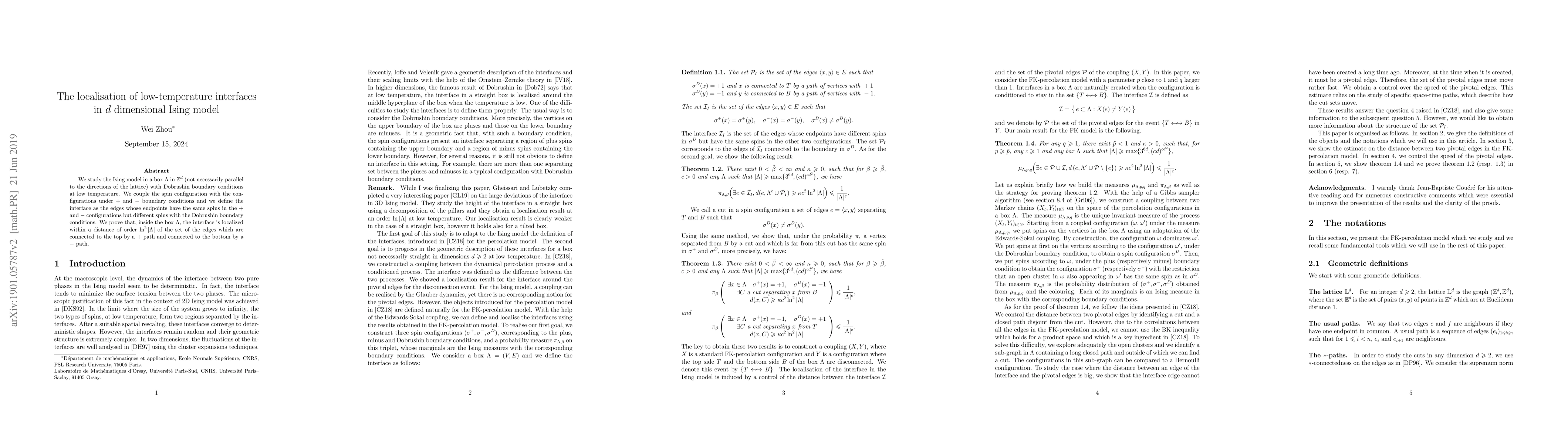 We study the Ising model in a box $\Lambda$ in $\mathbb{Z}^d$ (not necessarily parallel to the directions of the lattice) with Dobrushin boundary conditions at low temperature. We couple the spin configuration with the configurations under $+$ and $-$ boundary conditions and we define the interface as the edges whose endpoints have the same spins in the $+$ and $-$ configurations but different spins with the Dobrushin boundary conditions. We prove that, inside the box $\Lambda$, the interface is localized within a distance of order $\ln^2|\Lambda|$ of the set of the edges which are connected to the top by a $+$ path and connected to the bottom by a $-$ path.