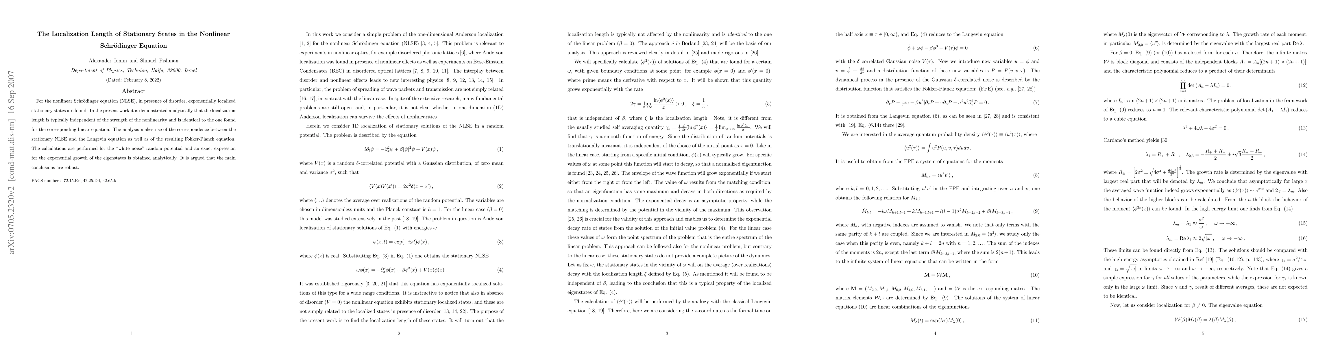 This paper demonstrates that the localization length of stationary states in the nonlinear Schrödinger equation with disorder is independent of the nonlinearity strength, matching that of the corresponding linear equation. The analysis leverages the correspondence between the NLSE and the Langevin equation, yielding an exact analytical expression for the exponential growth of eigenstates under a white noise random potential.