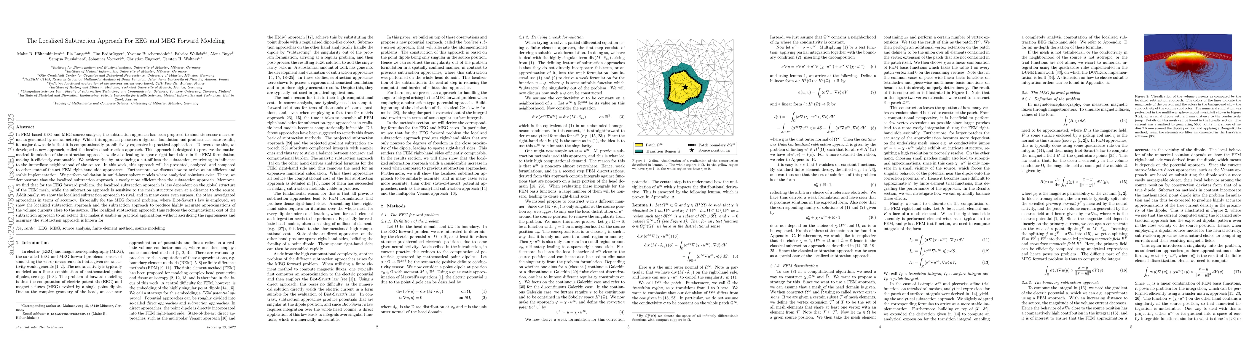 The localized subtraction approach for EEG and MEG forward modeling efficiently computes sensor measurements by restricting the subtraction influence to the source's immediate neighborhood, significantly reducing computational costs while maintaining accuracy and stability compared to traditional methods. This approach is shown to be more efficient and less dependent on global mesh structure, rivaling other state-of-the-art techniques.